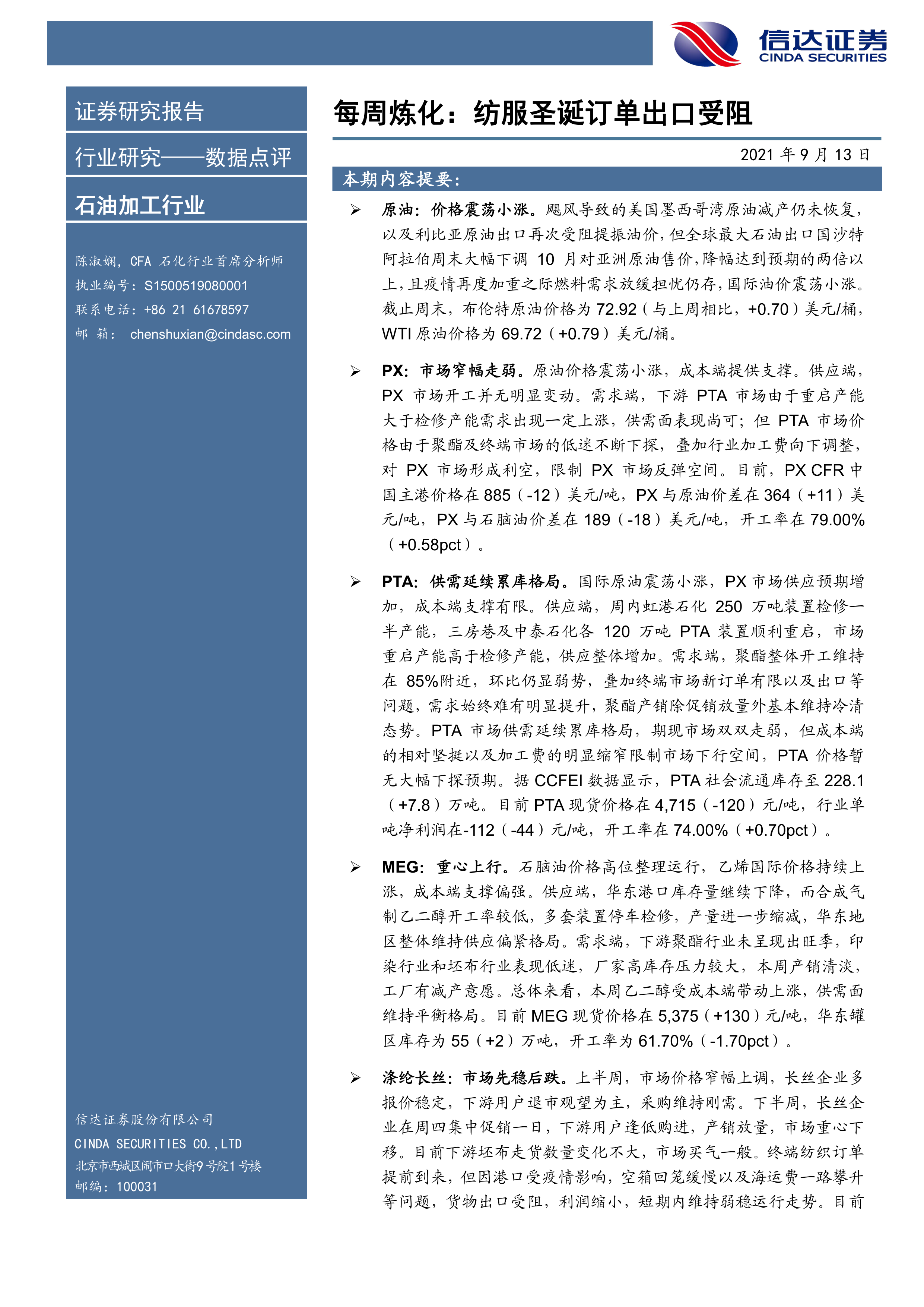 本报告的核心观点是:2021年9月,受原油价格震荡小涨、下游需求低迷以及疫情影响港口拥堵等因素影响,中国石化行业整体表现较为低迷。具体而言,PX、PTA、涤纶长丝等产品价格均出现不同程度的下跌,而MEG价格则逆势上涨。纺织服装行业圣诞订单出口受阻,进一步加剧了行业低迷态势。