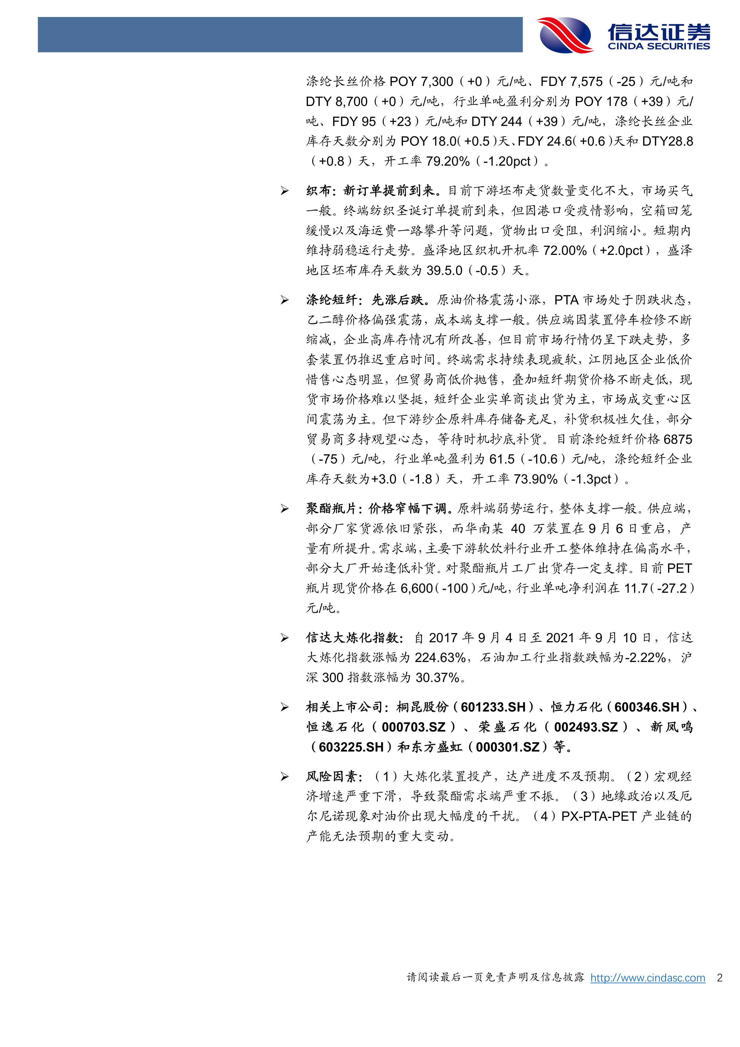 本报告基于大量数据和图表,对2021年9月中国石化行业主要产品的市场行情进行了全面分析。报告指出,受原油价格波动、下游需求低迷以及疫情影响等因素影响,石化行业整体表现低迷,部分产品价格下跌,但MEG价格逆势上涨。纺织服装行业出口受阻进一步加剧了行业低迷态势。投资者需关注相关风险因素,谨慎投资。 报告还提供了信达大炼化指数的走势以及相关上市公司信息,为投资者提供参考。