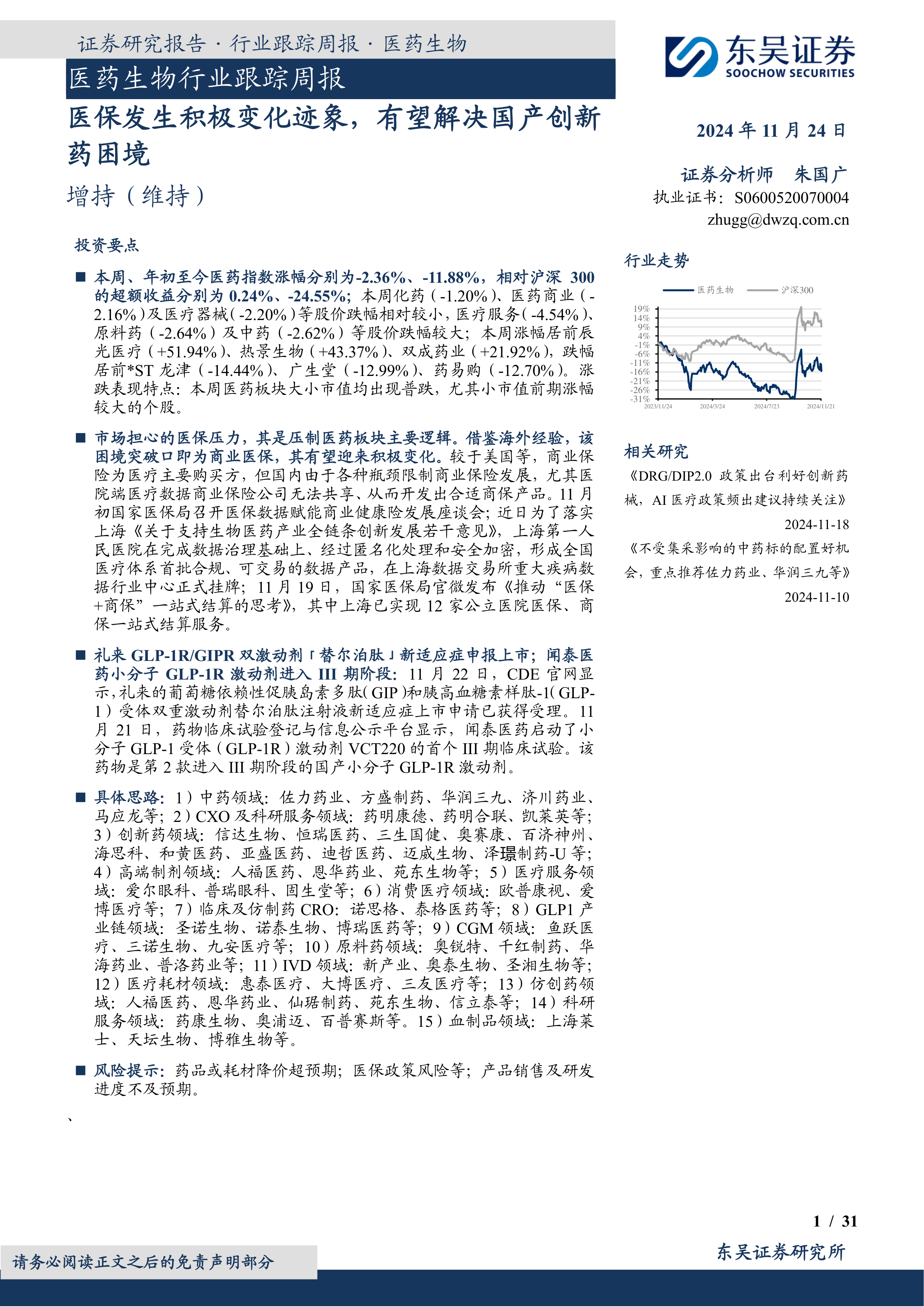 报告首先分析了医药行业近期市场表现。截至2024年11月22日,医药指数本周跌幅为-2.36%,年初至今跌幅为-11.88%,跑输沪深300指数。不同子板块表现差异较大,医药商业板块跌幅相对较小(-2.16%),而医疗服务、原料药和中药板块跌幅较大。个股方面,辰光医疗、热景生物和双成药业涨幅居前,*ST龙津、广生堂和药易购跌幅居前。总体来看,医药板块大小市值个股均出现普跌,尤其前期涨幅较大的小市值个股跌幅更显著。