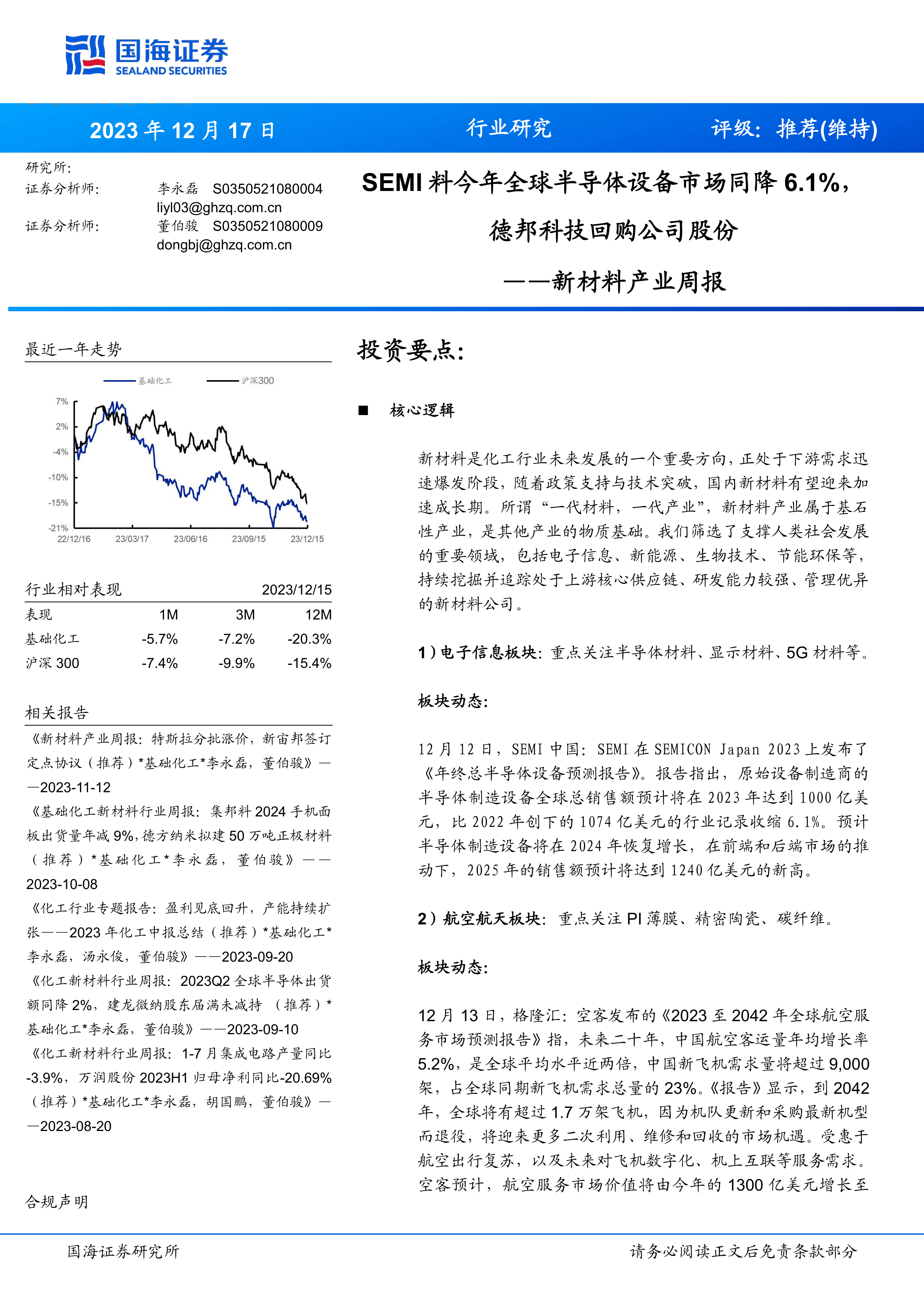 新材料产业周报:SEMI料今年全球半导体设备市场同降6.1%,德邦科技回购公司股份