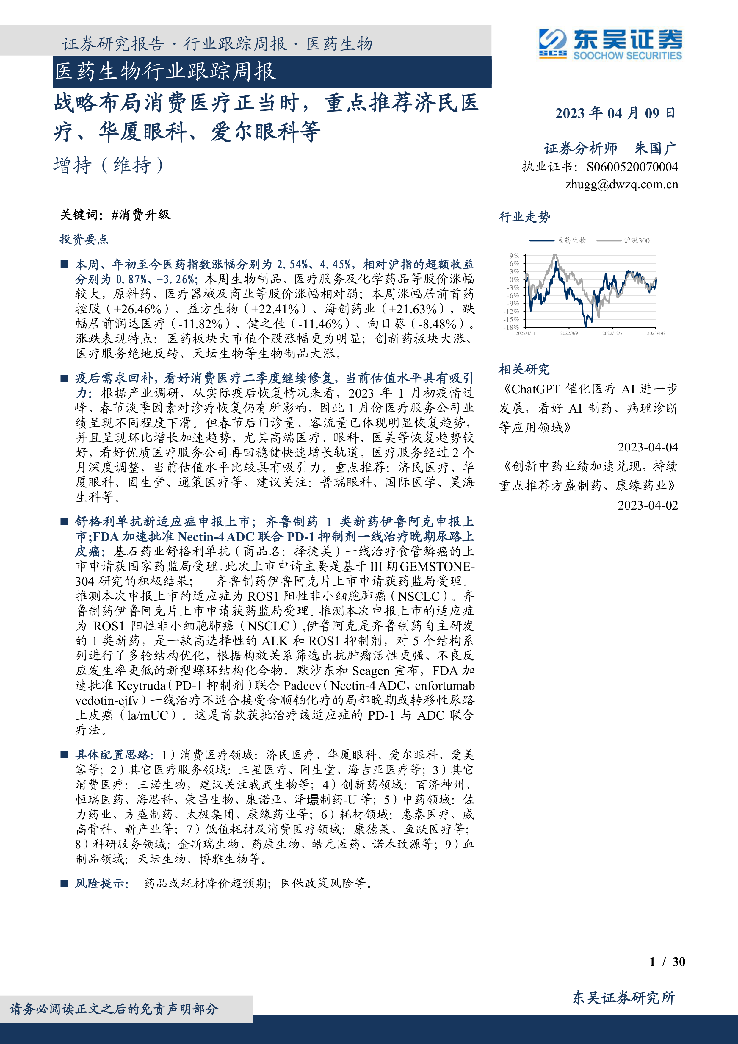 本报告的核心观点是:消费医疗板块在经历深度调整后,估值已具备吸引力,是战略布局的最佳时机。同时,创新药板块也显现出见底回升的信号,中药板块则持续领涨,受益于政策支持和业绩兑现。报告建议重点关注消费医疗领域的济民医疗、华厦眼科、爱尔眼科等,以及创新药领域的恒瑞医药、百济神州等,并推荐方盛制药、康缘药业等中药标的。