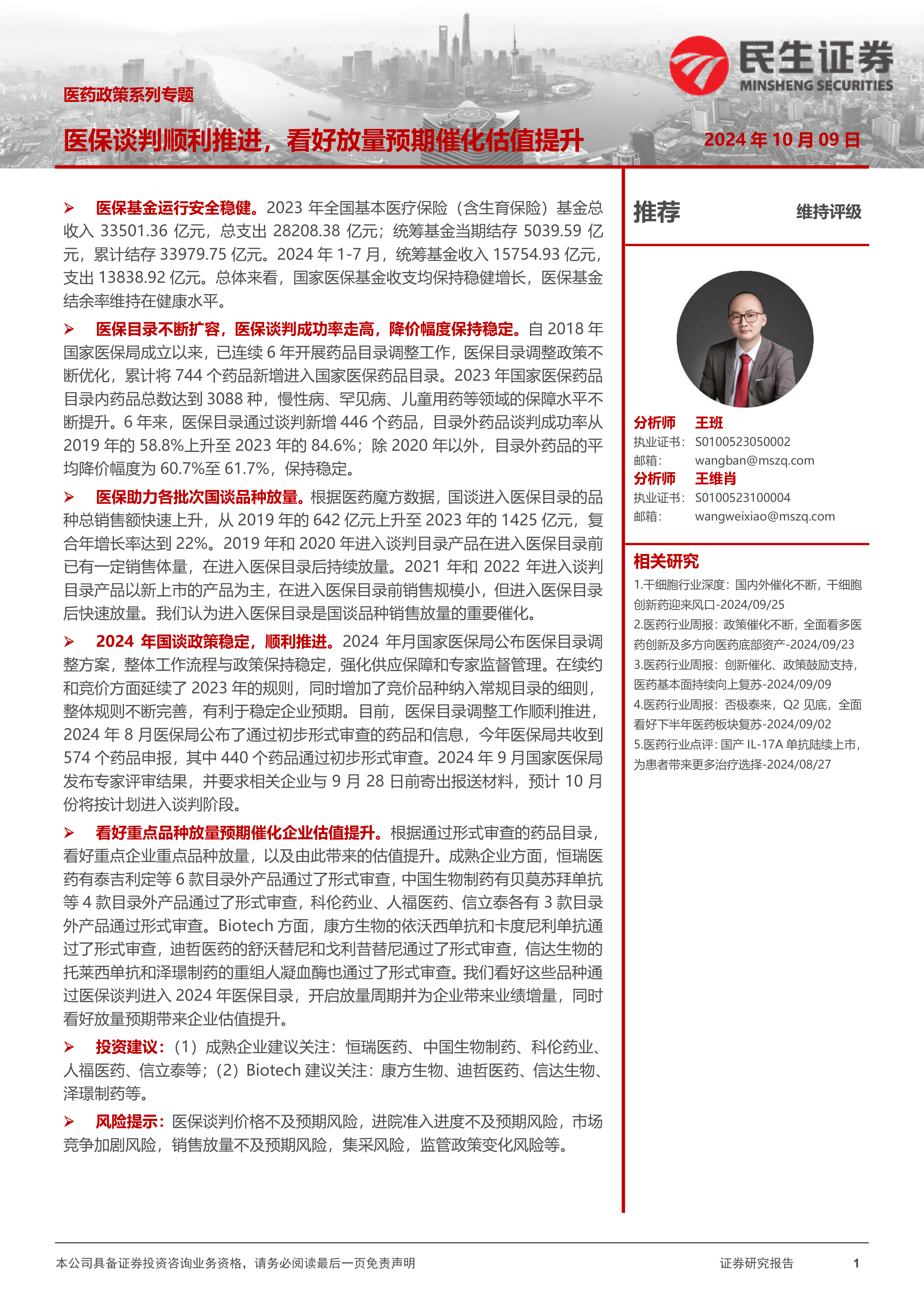 报告最后提出了投资建议,建议关注恒瑞医药、中国生物制药、科伦药业、人福医药、信立泰等成熟企业,以及康方生物、迪哲医药、信达生物、泽璟制药等Biotech公司。同时,报告也提示了医保谈判价格不及预期、进院准入进度不及预期、市场竞争加剧、销售放量不及预期、集采以及监管政策变化等风险。