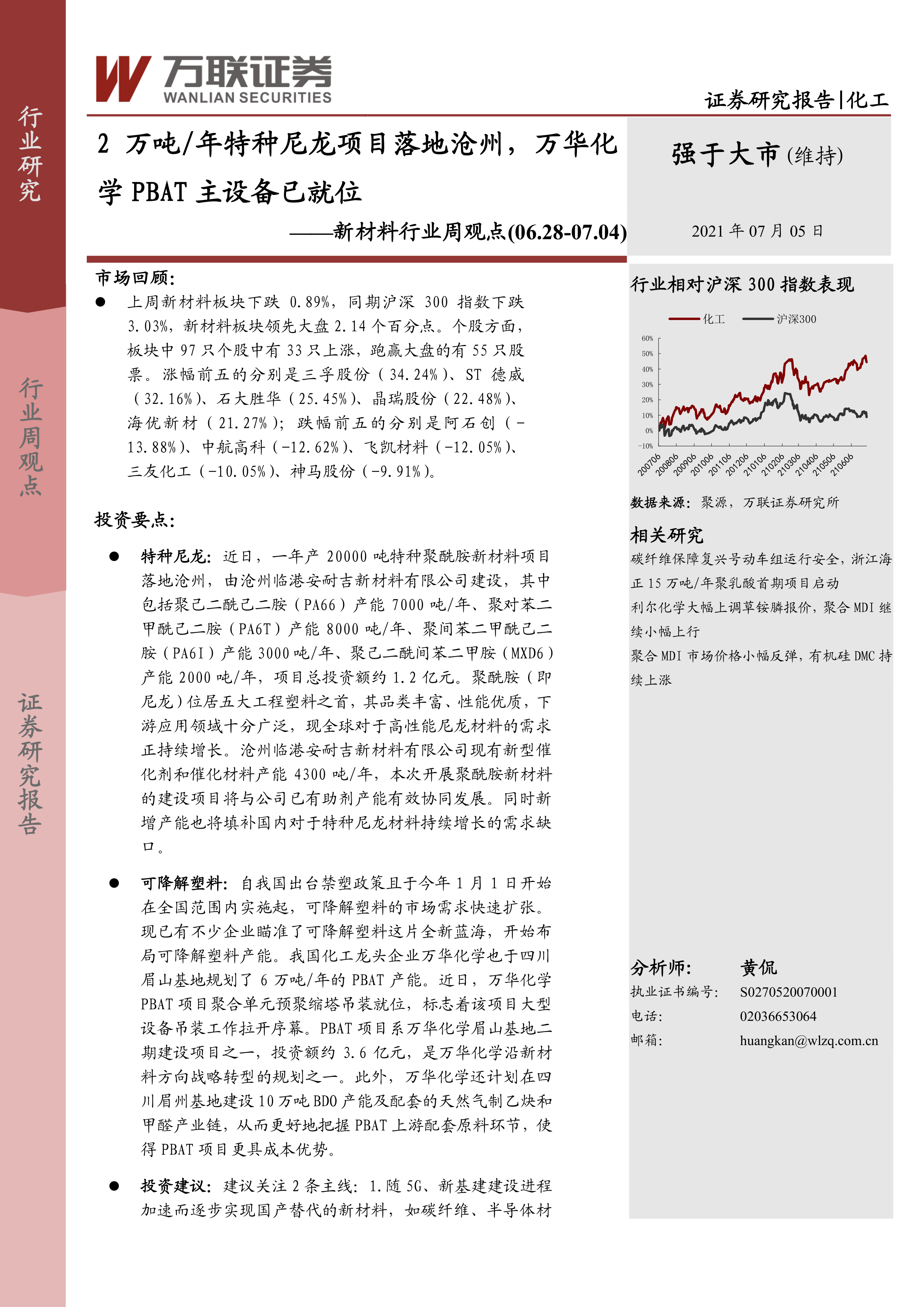 新材料行业周观点:2万吨/年特种尼龙项目落地沧州,万华化学PBAT主设备已就位