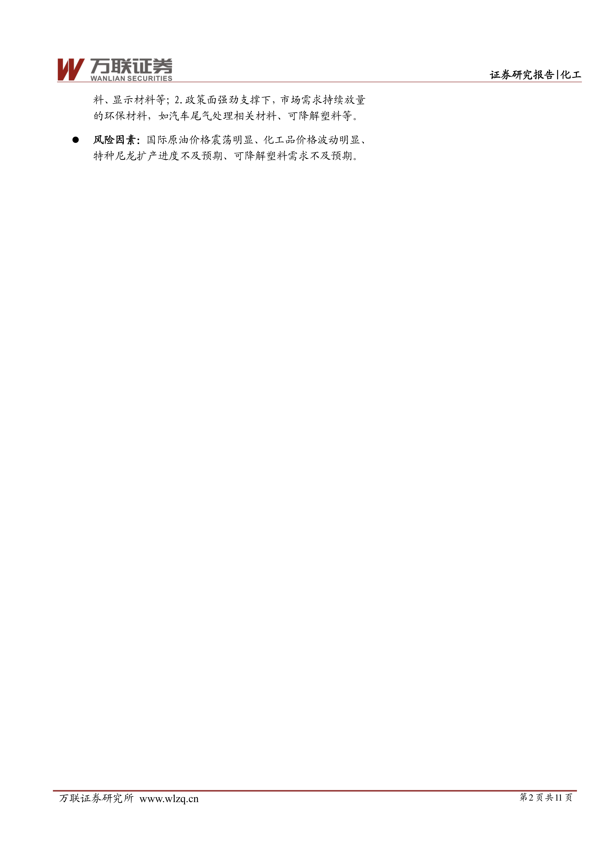 风险因素:国际原油价格震荡明显、化工品价格波动明显、特种尼龙扩产进度不及预期、可降解塑料需求不及预期。
