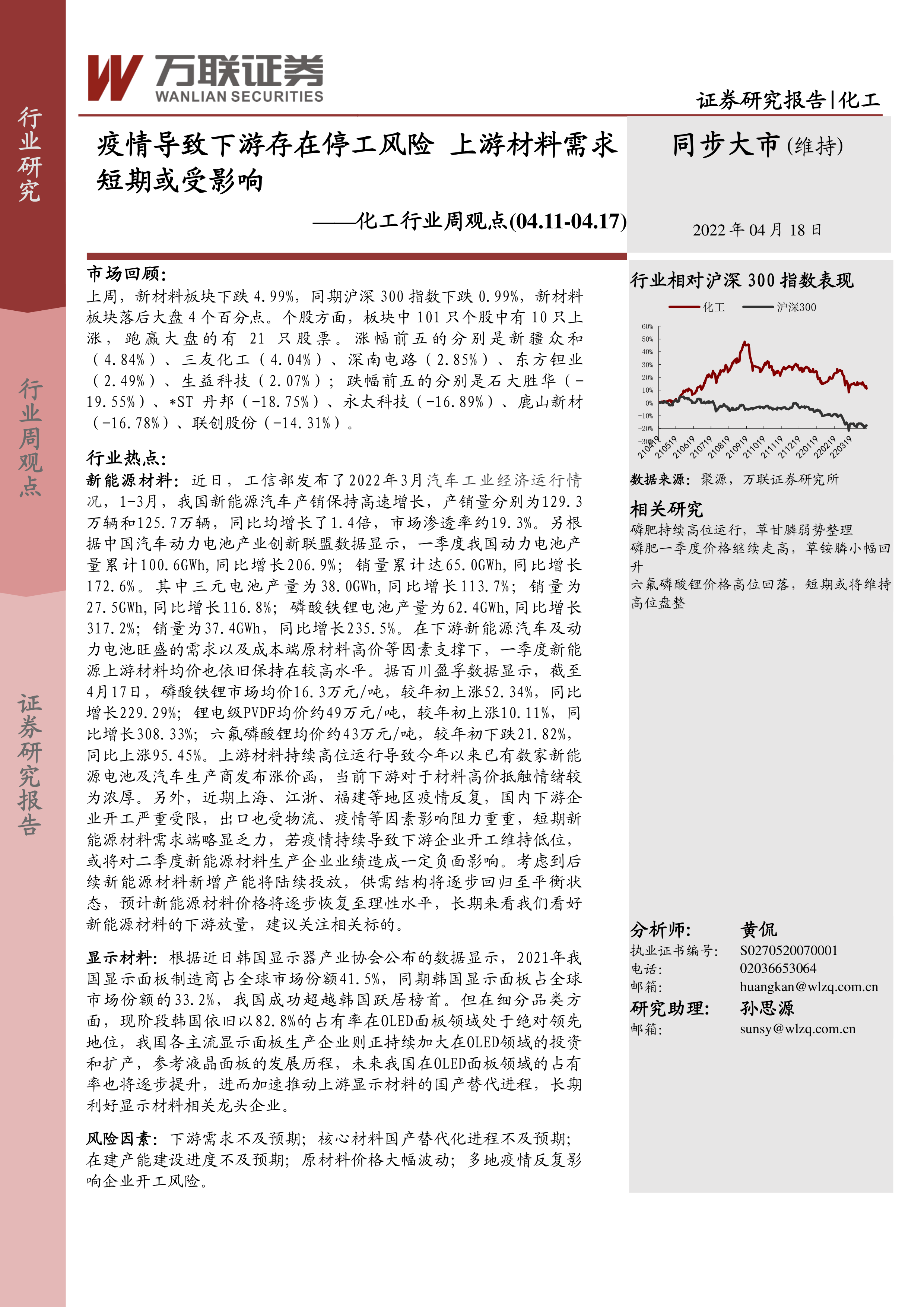 本报告分析了化工行业,特别是新材料板块的市场现状及未来发展趋势。短期来看,疫情对新能源材料需求端造成一定冲击,但长期来看,新能源汽车市场的高速增长将持续驱动新能源材料需求。同时,中国显示面板产业的崛起以及OLED领域的国产替代进程将为相关企业带来发展机遇。投资者需关注相关风险因素,谨慎投资。