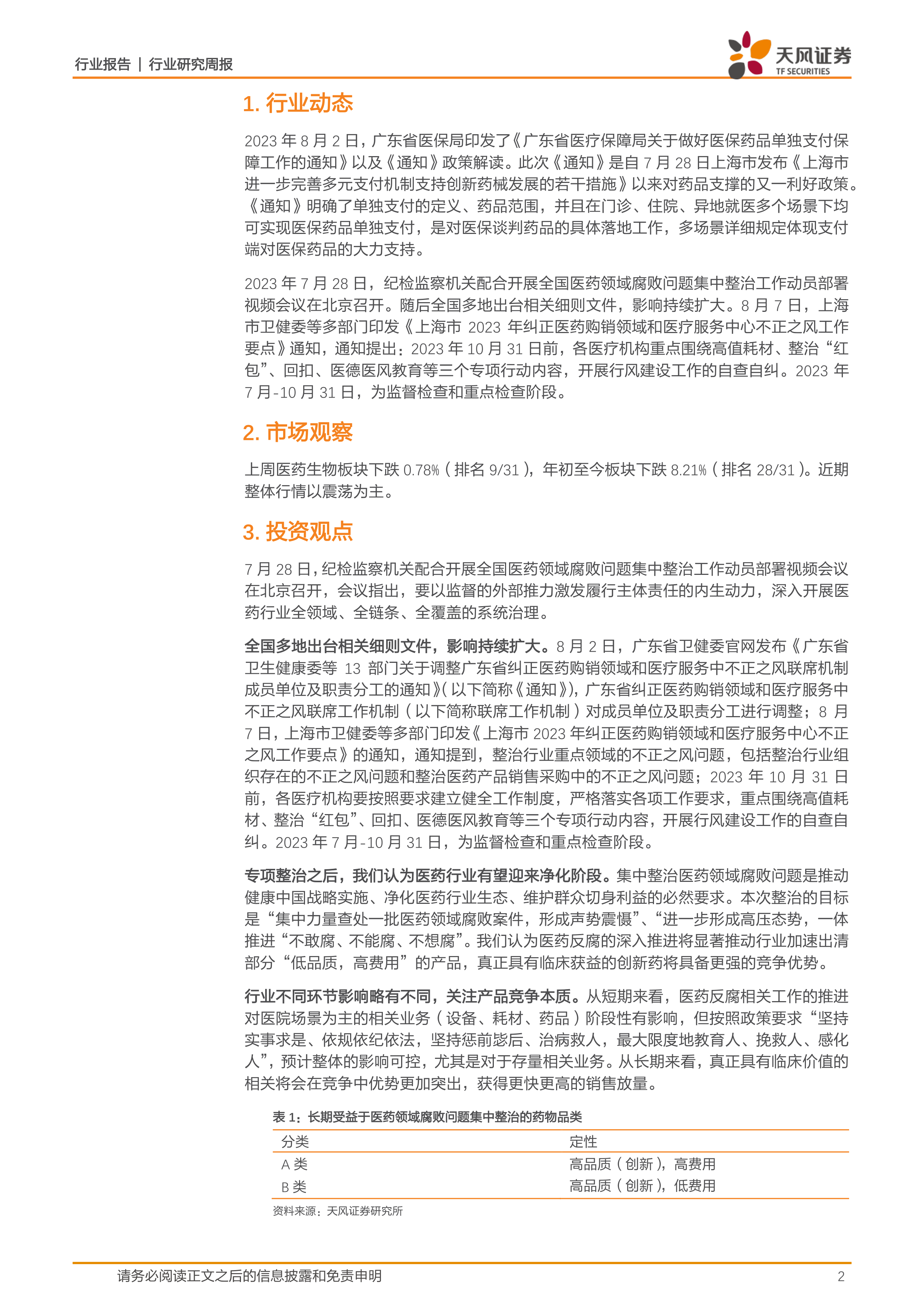 报告首先概述了近期医药行业的重要动态,包括广东省和上海市出台的利好创新药械发展的政策,以及全国范围内开展的医药领域腐败问题集中整治工作。这些政策和行动对医药行业产生了深远的影响,既带来了挑战,也带来了机遇。广东省医保局印发的《通知》以及上海市发布的《若干措施》都体现了支付端对医保药品的大力支持,为医保谈判药品的落地提供了保障。而全国范围内的医药反腐行动则旨在净化行业生态,维护群众利益。