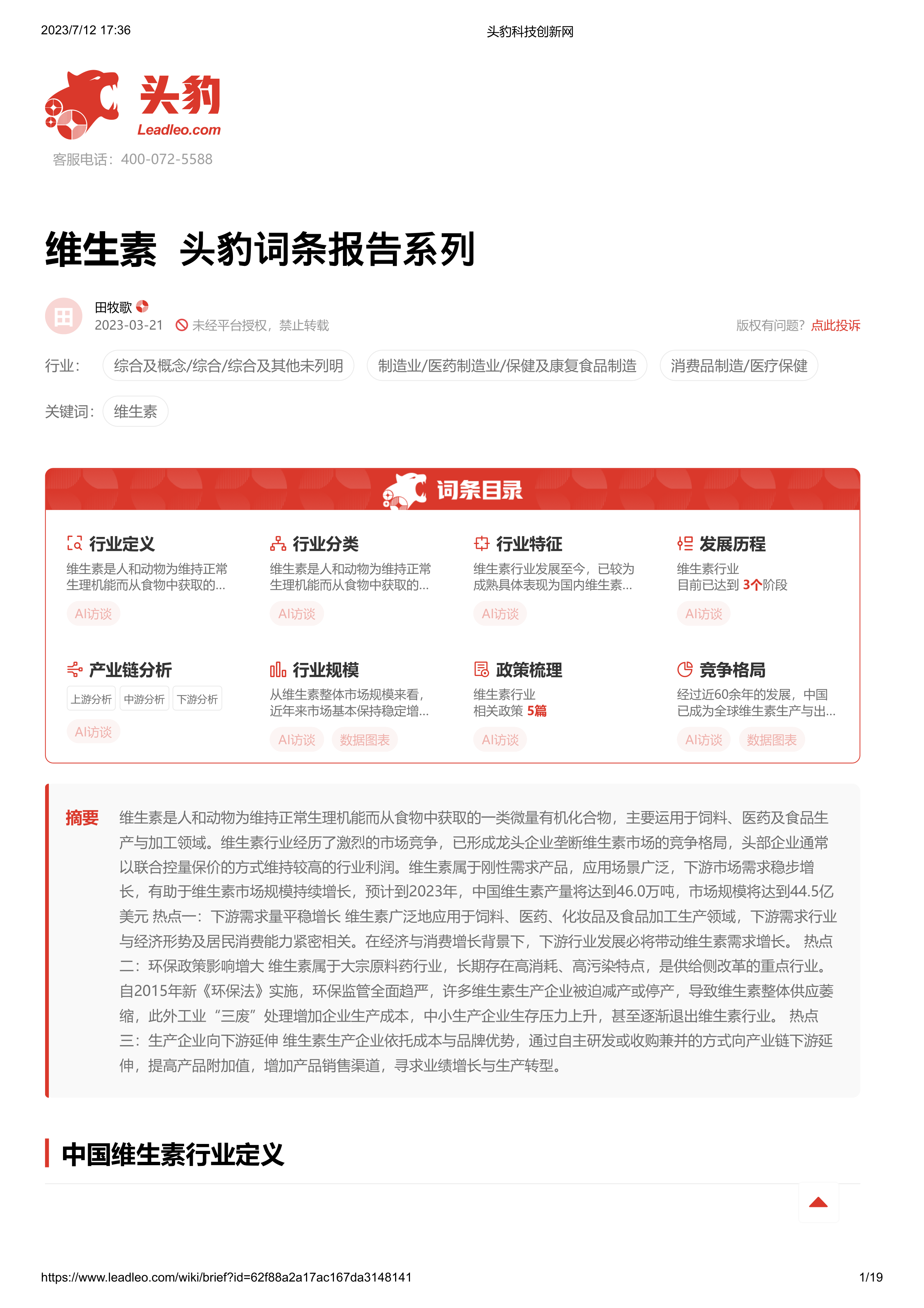 本报告基于头豹科技创新网提供的维生素行业报告数据,对中国维生素行业市场规模、竞争格局、产业链、政策环境以及发展历程进行分析。核心观点如下: