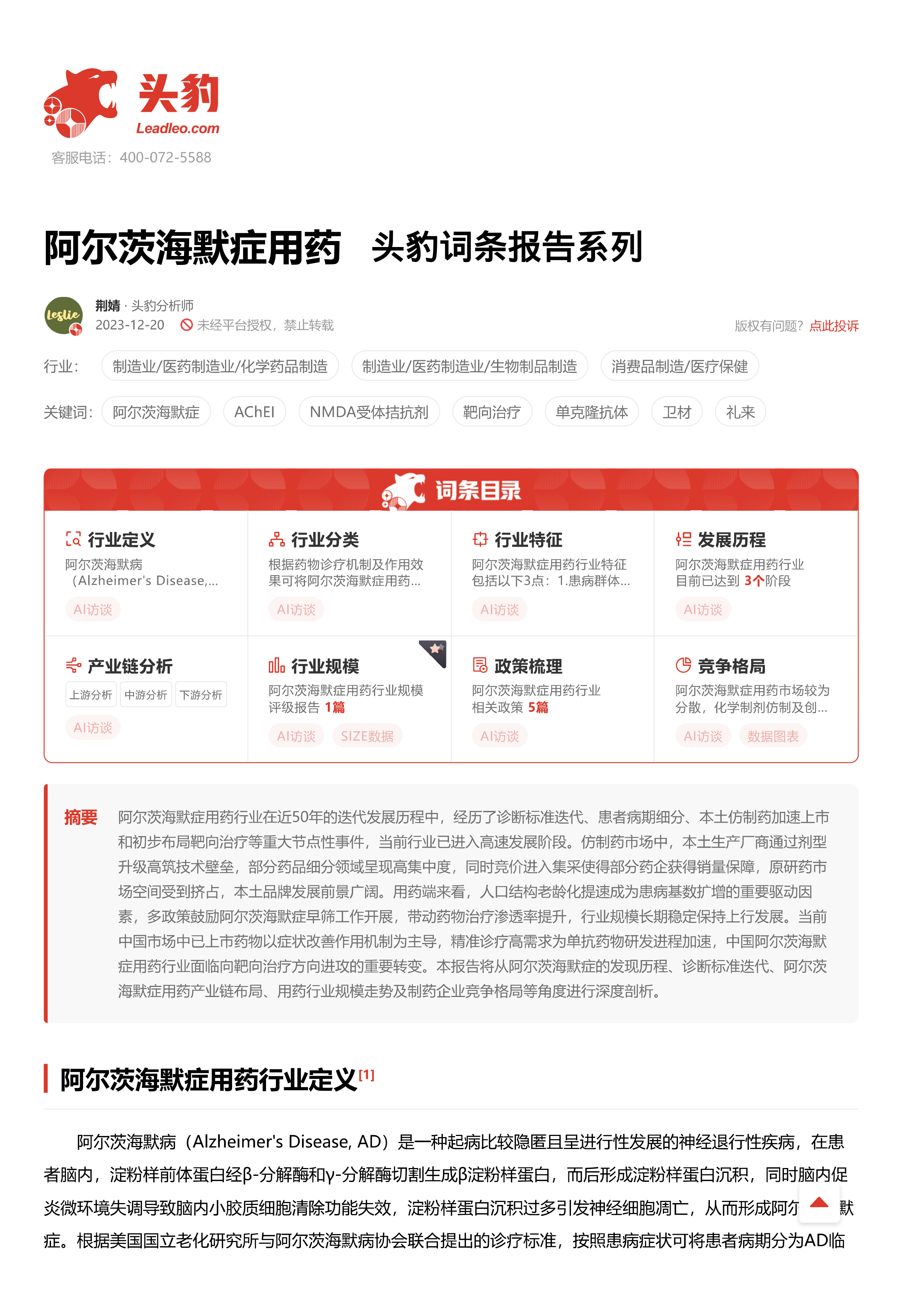 阿尔茨海默症用药 头豹词条报告系列
