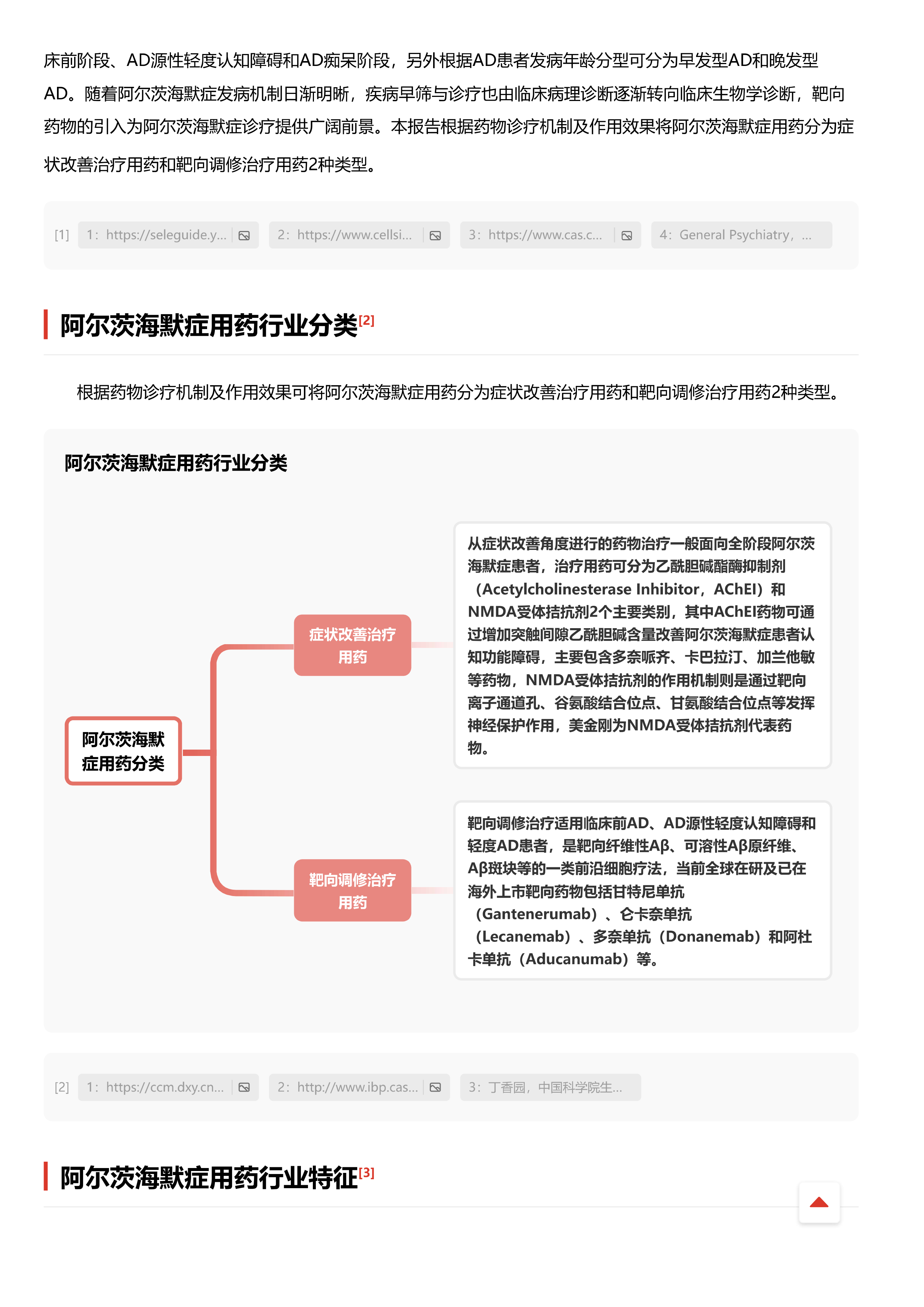 阿尔茨海默症用药行业在近50年的选代发展历程中,经历了诊断标准送代、患者病期细分、本土仿制药加速上市和初步布局把向治疗等重大节点性事件,当前行业已进入高速发展阶段。仿制药市场中,本土生产厂商通过剂型升级高筑技术壁垒,部分药品细分领域呈现高集中度,同时竞价进入集采使得部分药企获得销量保障,原研药市场空间受到挤占,本土品牌发展前景广阔。用药端来看,人口结构老龄化提速成为患病基数扩增的重要驱动因素,多政策鼓励阿尔茨海默症早筛工作开展,带动药物治疗渗透率提升,行业规模长期稳定保持上行发展。当前中国市场中已上市药物以症状改善作用机制为主导,精准诊疗高需求为单抗药物研发进程加速,中国阿尔茨海默定用药行业面临向朝向治疗方向进攻的重要转变。本报告将从阿尔茨海默症的发现历程、诊断标准选代、阿尔茨每默症用药产业链布局、用药行业规模走势及制药企业竞争格局等角度进行深度部析。