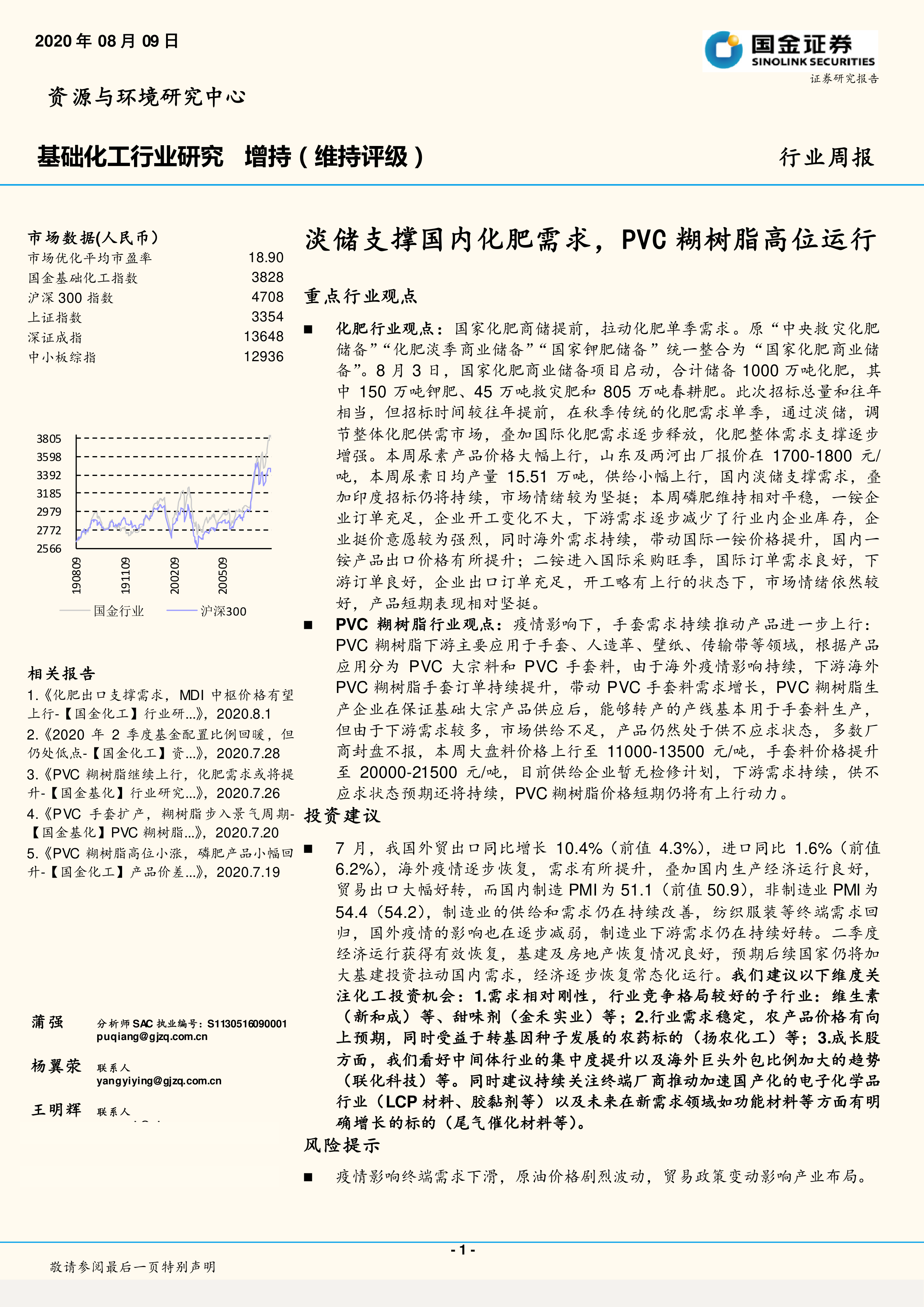 本报告基于市场数据和行业动态,对化工行业,特别是化肥、PVC糊树脂等子行业进行了分析。国家化肥储备政策的实施和海外疫情对PVC糊树脂市场的影响是本周市场的主要驱动因素。部分化工产品价格上涨,部分下跌,行业表现分化。报告建议投资者关注需求刚性强、竞争格局好、行业需求稳定的子行业,以及具有成长潜力的中间体、电子化学品和功能材料等领域,同时需关注疫情、原油价格和贸易政策等风险因素。 报告中提供的图表数据对市场走势的判断提供了有力支撑。