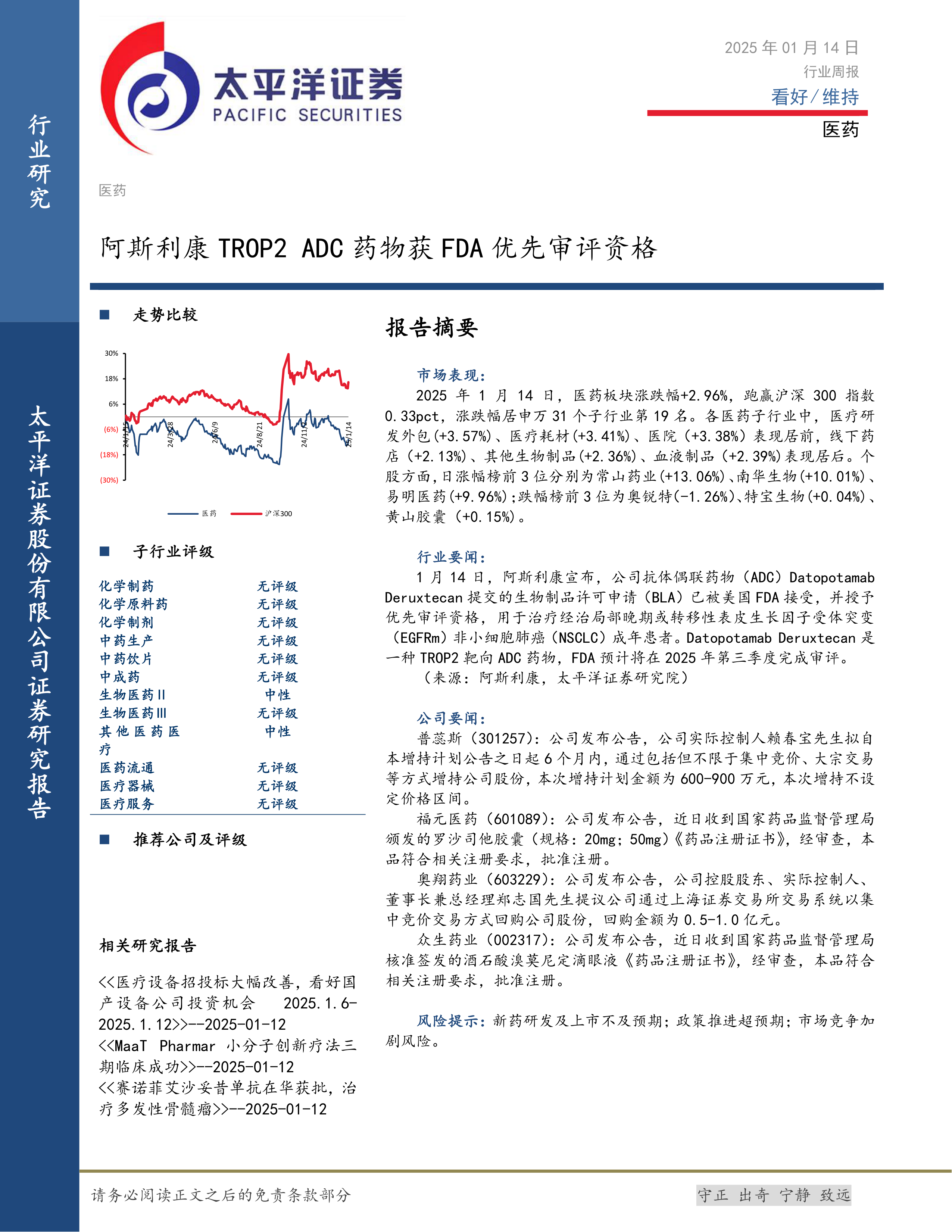 本报告的核心观点是:医药板块整体表现良好,跑赢沪深300指数,部分子行业及个股表现突出。阿斯利康TROP2 ADC药物获得FDA优先审评资格是本周医药行业的重要事件,对行业发展具有积极影响。同时,报告也关注了部分上市公司的重要公告,例如普蕊斯、福元医药、奥翔药业和众生药业的增持或回购计划以及新药获批等信息。