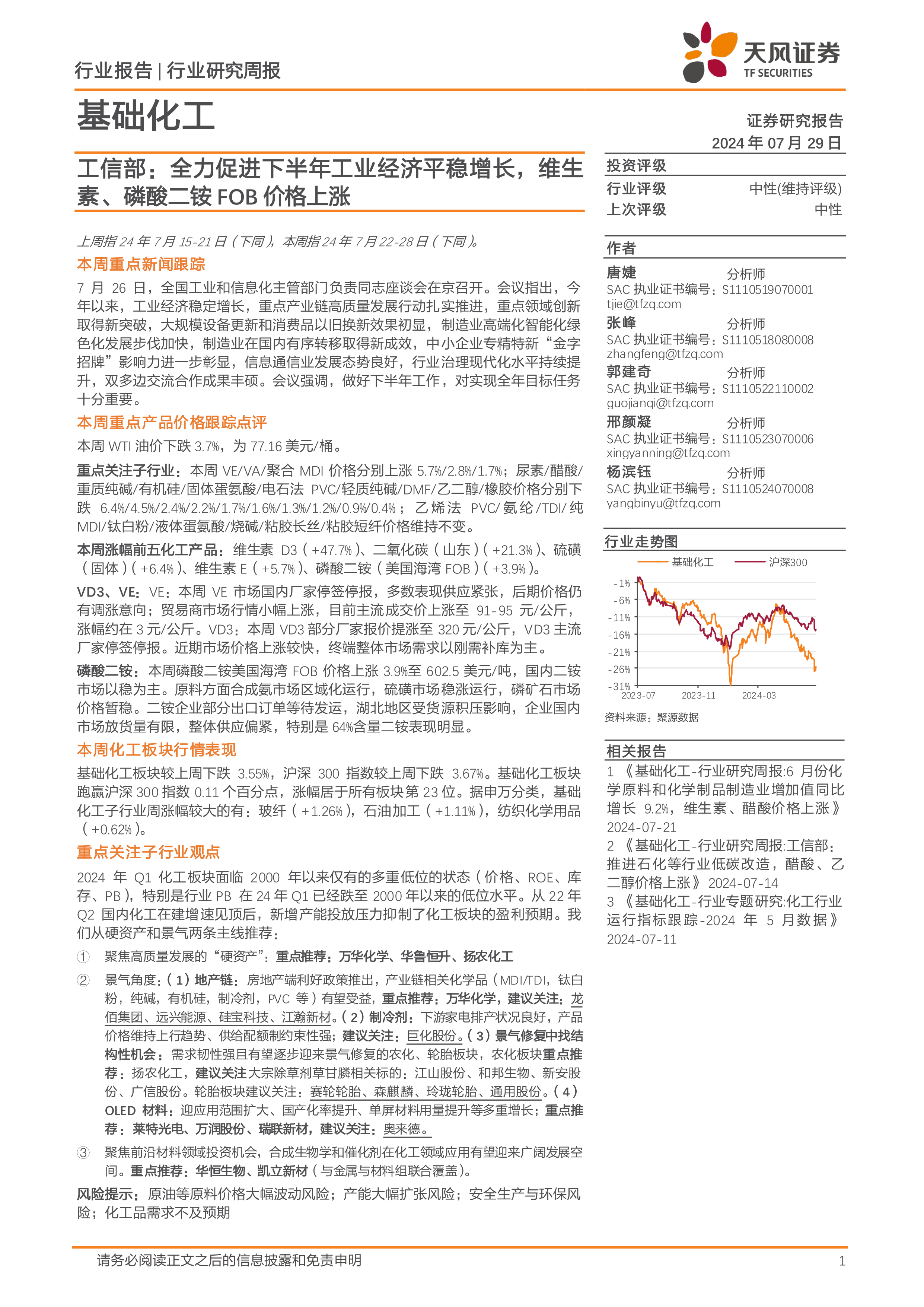 基础化工行业研究周报:工信部:全力促进下半年工业经济平稳增长,维生素、磷酸二铵FOB价格上涨