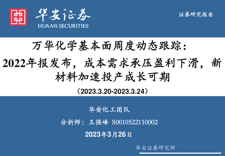万华化学基本面周度动态跟踪:2022年报发布,成本需求承压盈利下滑,新材料加速投产成长可期