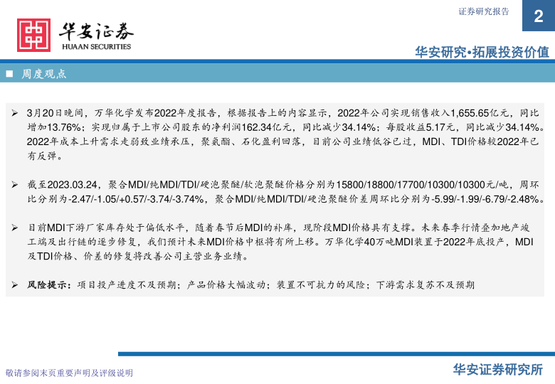 本报告的核心观点是:万华化学2022年年报显示,尽管成本上升和需求走弱导致盈利下滑,但公司已度过业绩低谷,新材料业务加速投产,未来成长可期。MDI和TDI价格的反弹以及下游需求的逐步复苏将改善公司主营业务业绩。
