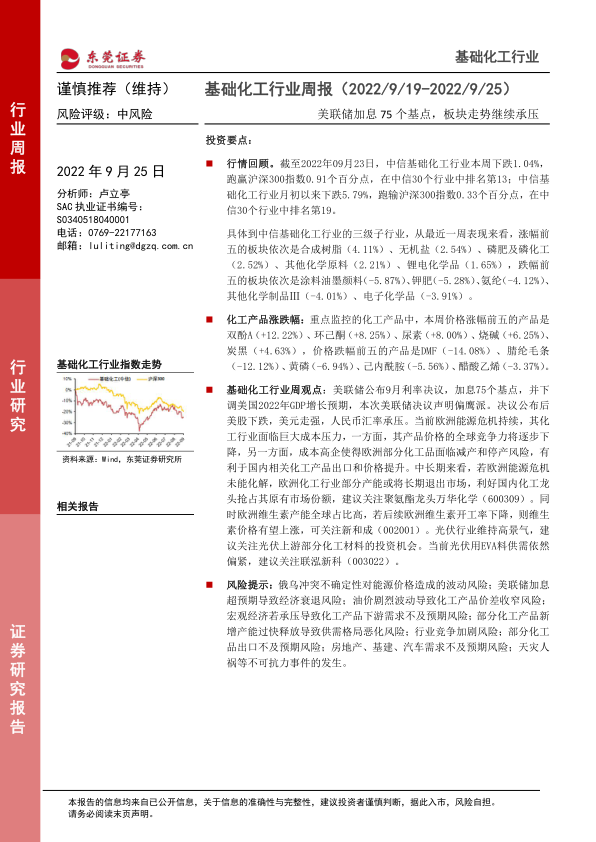 基础化工行业周报:美联储加息75个基点,板块走势继续承压