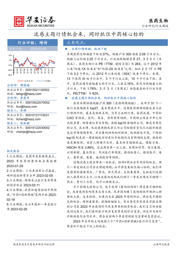 本报告的核心观点是:医药生物行业本周表现疲软,跑输大盘,但流感主题和中药板块仍存在投资机会。 具体而言,报告分析了本周医药行业整体表现、估值水平、子行业分化,并重点关注了流感主题带来的短期机会以及中药板块的长期投资价值。 同时,报告还分析了创新药板块受药品集采政策的影响,并对未来值得关注的标的进行了展望。