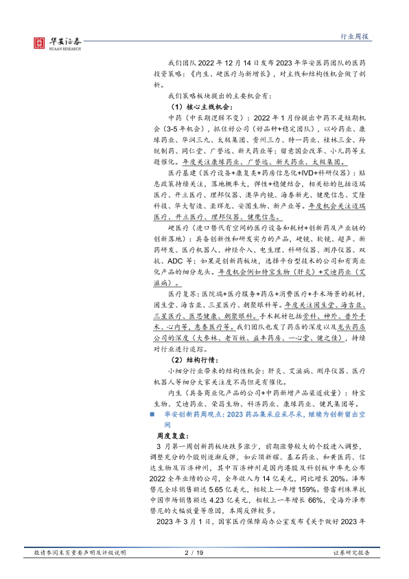 我们团队2022年12月14日发布2023年华安医药团队的医药投资策略:《内生、硬医疗与新增长》,对主线和结构性机会做了剖析。