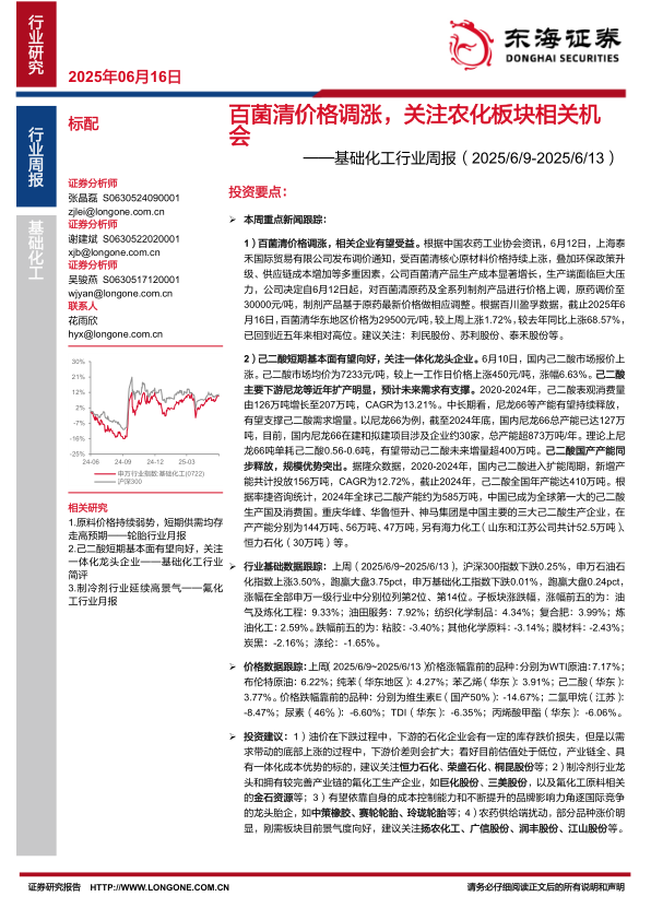 本报告的核心观点是:基础化工行业近期呈现出分化态势,部分细分领域景气度向好,部分领域则面临挑战。百菌清和己二酸价格上涨,为相关企业带来利好;但整体市场受宏观经济和国际形势影响,存在一定风险。报告建议关注具有成本控制能力和一体化优势的龙头企业,以及国产替代新材料领域的龙头企业。