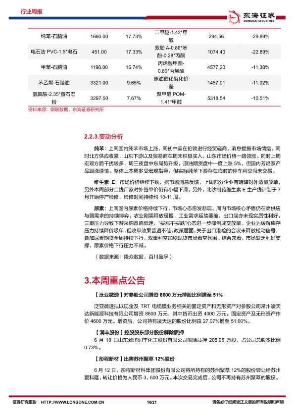 价格数据跟踪:上周(2025/6/9~2025/6/13)价格涨幅靠前的品种:分别为WTI原油:7.17%布伦特原油:6.22%;纯苯(华东地区):4.27%;苯乙烯(华东):3.91%;己二酸(华东)3.77%。价格跌幅靠前的品种:分别为维生素E(国产50%):-14.67%;二氯甲烷(江苏):-8.47%;尿素(46%):-6.60%;TDI(华东):-6.35%;丙烯酸甲酯(华东):-6.06%。