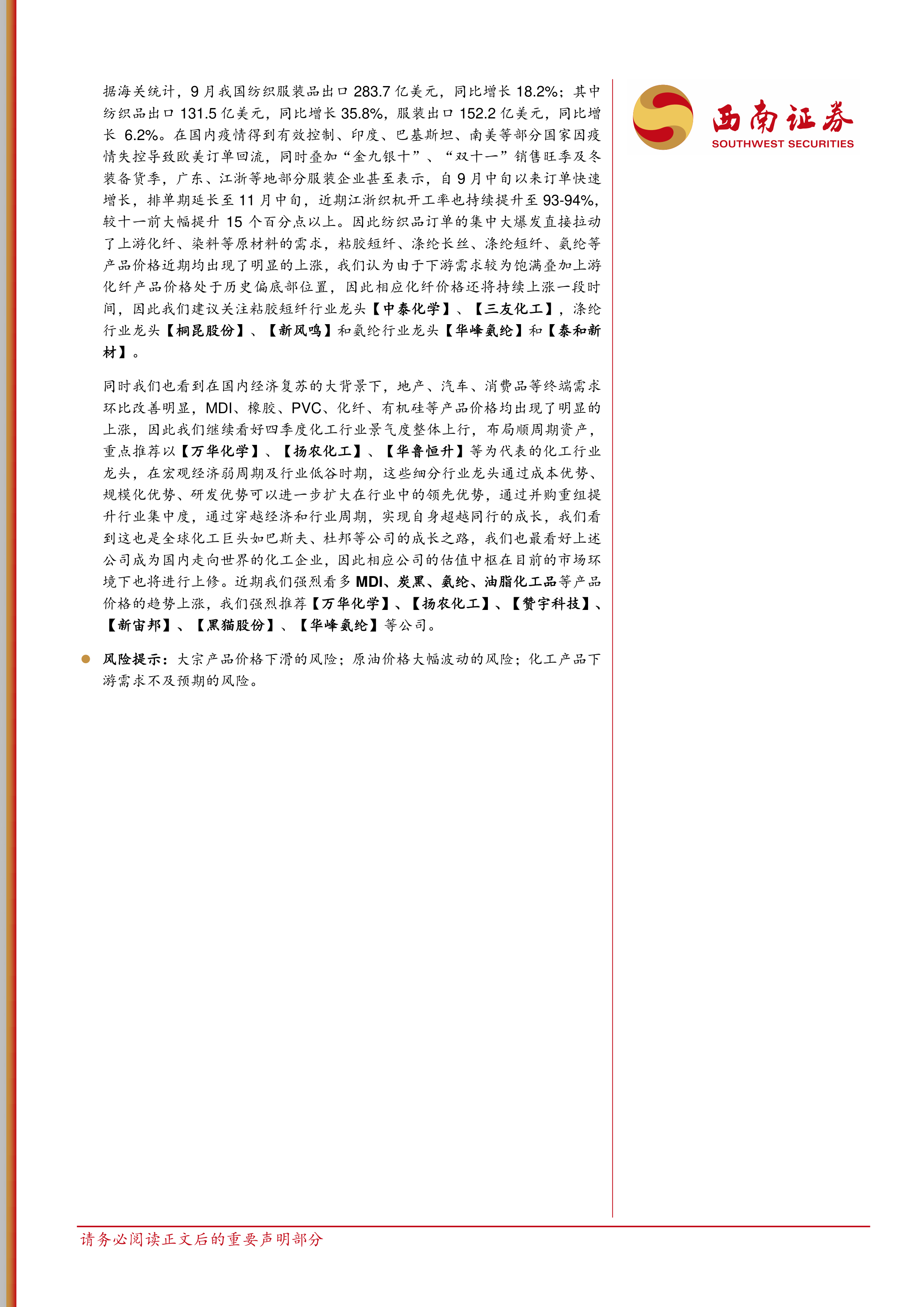据海关统计,9月我国纺织服装品出口283.7亿美元,同比增长18.2%;其中纺织品出口131.5亿美元,同比增长35.8%,服装出口152.2亿美元,同比增长6.2%。在国内疫情得到有效控制、印度、巴基斯坦、南美等部分国家因疫情失控导致欧美订单回流,同时叠加“金九银十”、“双十一”销售旺季及冬装备货季,广东、江浙等地部分服装企业甚至表示,自9月中旬以来订单快速增长,排单期延长至11月中旬,近期江浙织机开工率也持续提升至93-94%,较十一前大幅提升15个百分点以上。因此纺织品订单的集中大爆发直接拉动了上游化纤、染料等原材料的需求,粘胶短纤、涤纶长丝、涤纶短纤、氨纶等产品价格近期均出现了明显的上涨,我们认为由于下游需求较为饱满叠加上游化纤产品价格处于历史偏底部位置,因此相应化纤价格还将持续上涨一段时间,因此我们建议关注粘胶短纤行业龙头【中泰化学】、【三友化工】,涤纶行业龙头【桐昆股份】、【新风鸣】和氨纶行业龙头【华峰氨纶】和【泰和新材】。