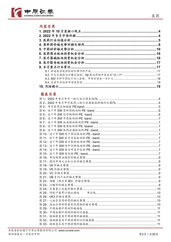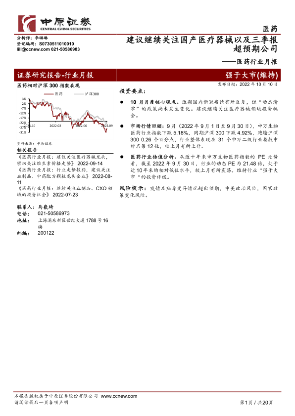 本报告的核心观点是:尽管近期国内新冠疫情反复,但“动态清零”政策保持不变。医药行业整体表现略好于上月,但估值处于近十年来的相对低位。报告建议投资者继续关注国产医疗器械和三季报超预期公司,并对原料药、中药材价格走势及医药行业各细分板块的投资机会进行了深入分析,同时提示了疫情、中美关系和政策变化等风险。