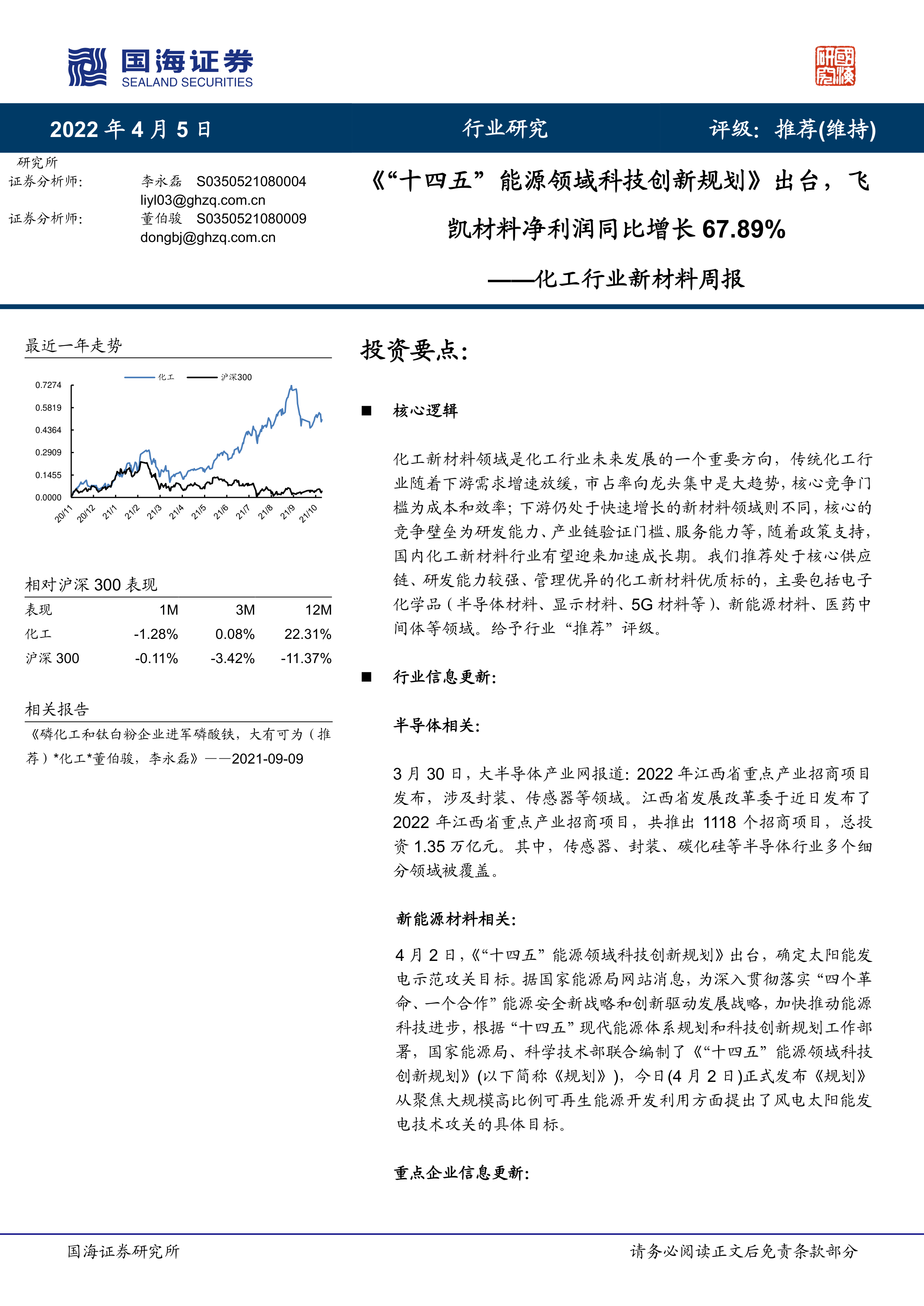 化工行业新材料周报:《“十四五”能源领域科技创新规划》出台,飞凯材料净利润同比增长67.89%