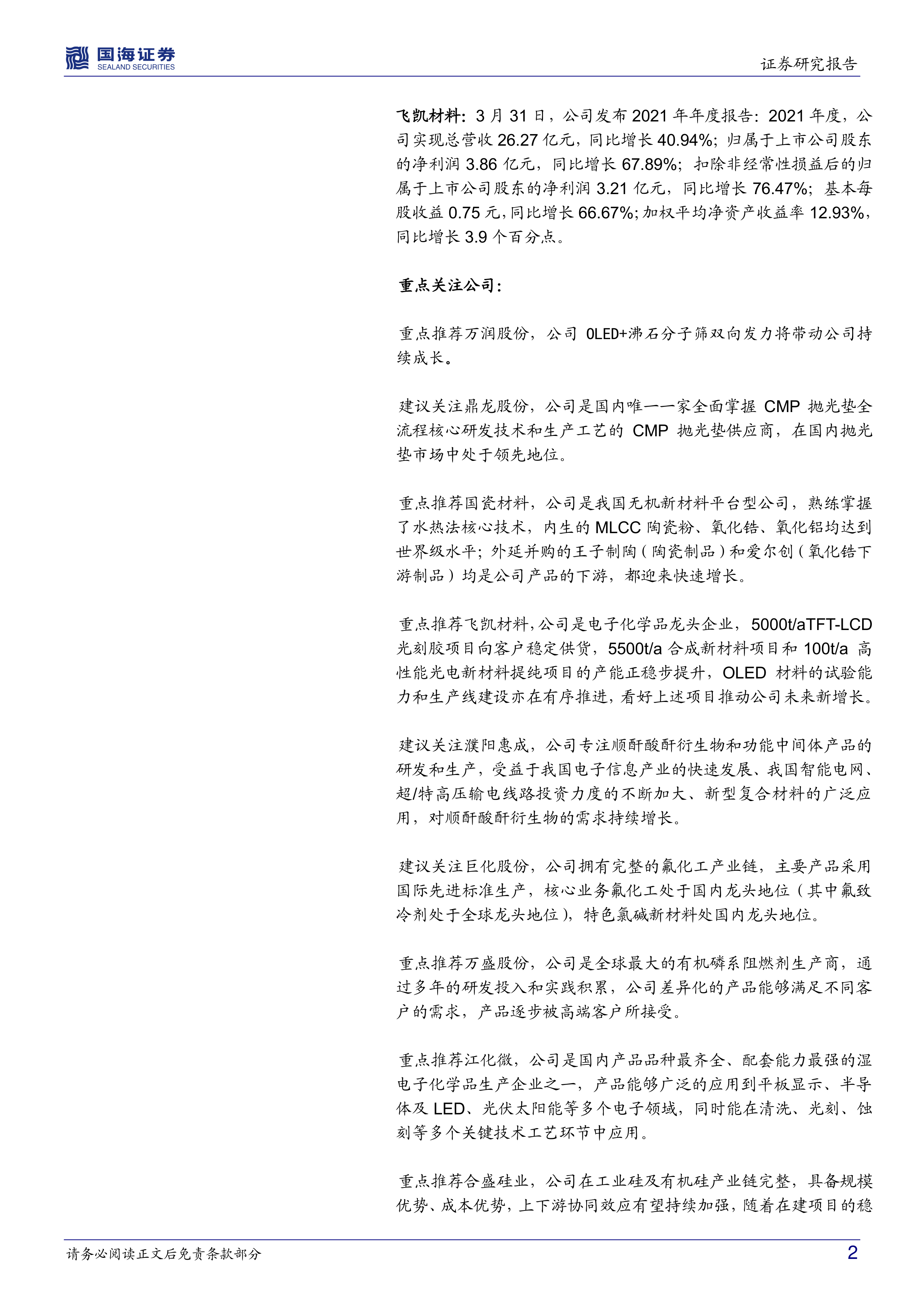 重点推荐飞凯材料,公司是电子化学品龙头企业,5000t/aTFT-LCD光刻胶项目向客户稳定供货,5500t/a 合成新材料项目和 100t/a 高性能光电新材料提纯项目的产能正稳步提升,OLED 材料的试验能力和生产线建设亦在有序推进,看好上述项目推动公司未来新增长。建议关注濮阳惠成,公司专注顺酐酸酐衍生物和功能中间体产品的研发和生产,受益于我国电子信息产业的快速发展、我国智能电网、超/特高压输电线路投资力度的不断加大、新型复合材料的广泛应用,对顺酐酸酐衍生物的需求持续增长。