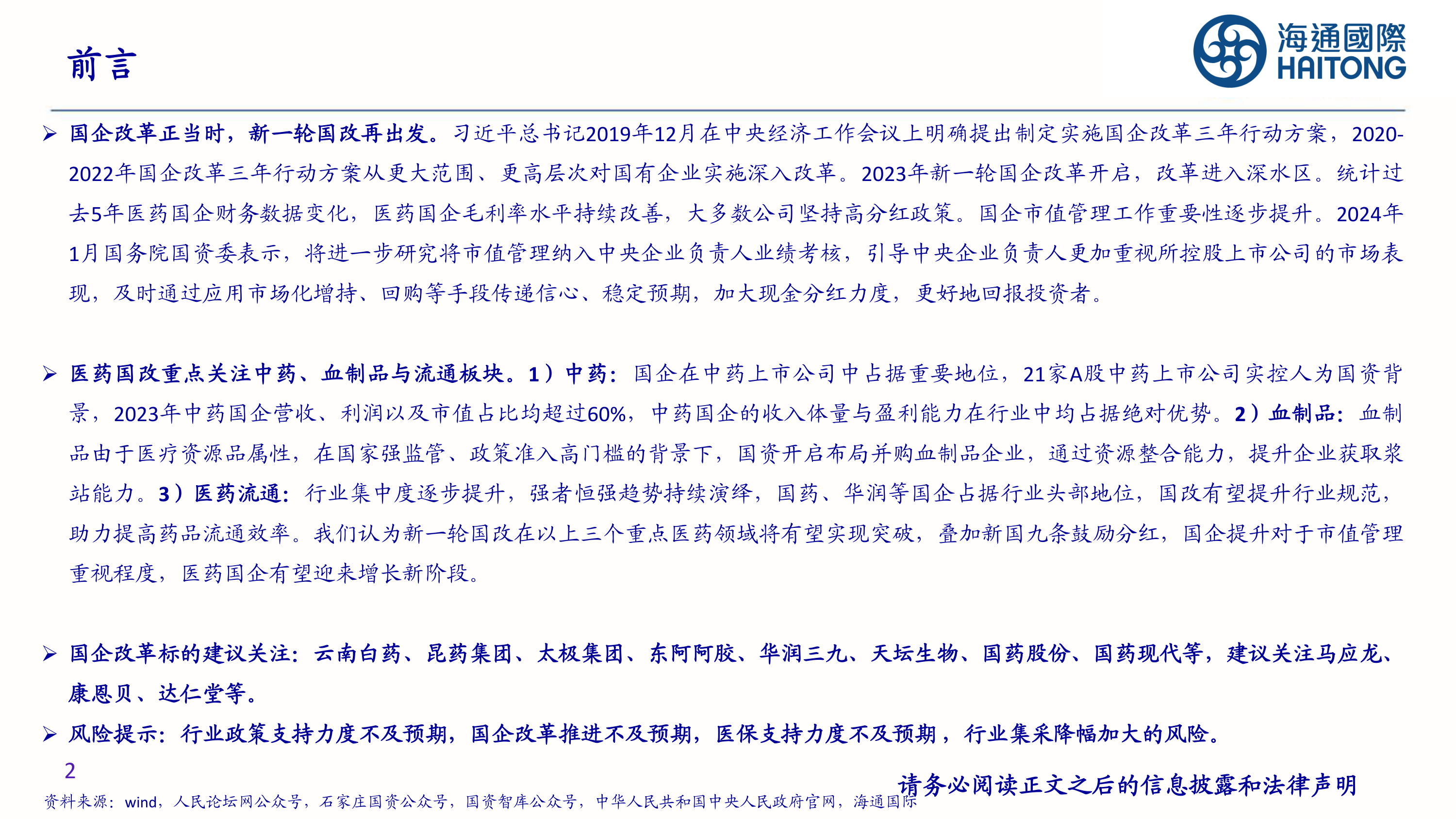 风险提示:行业政策支持力度不及预期,国企改革推进不及预期,医保支持力度不及预期,行业集采降幅加大的风险。