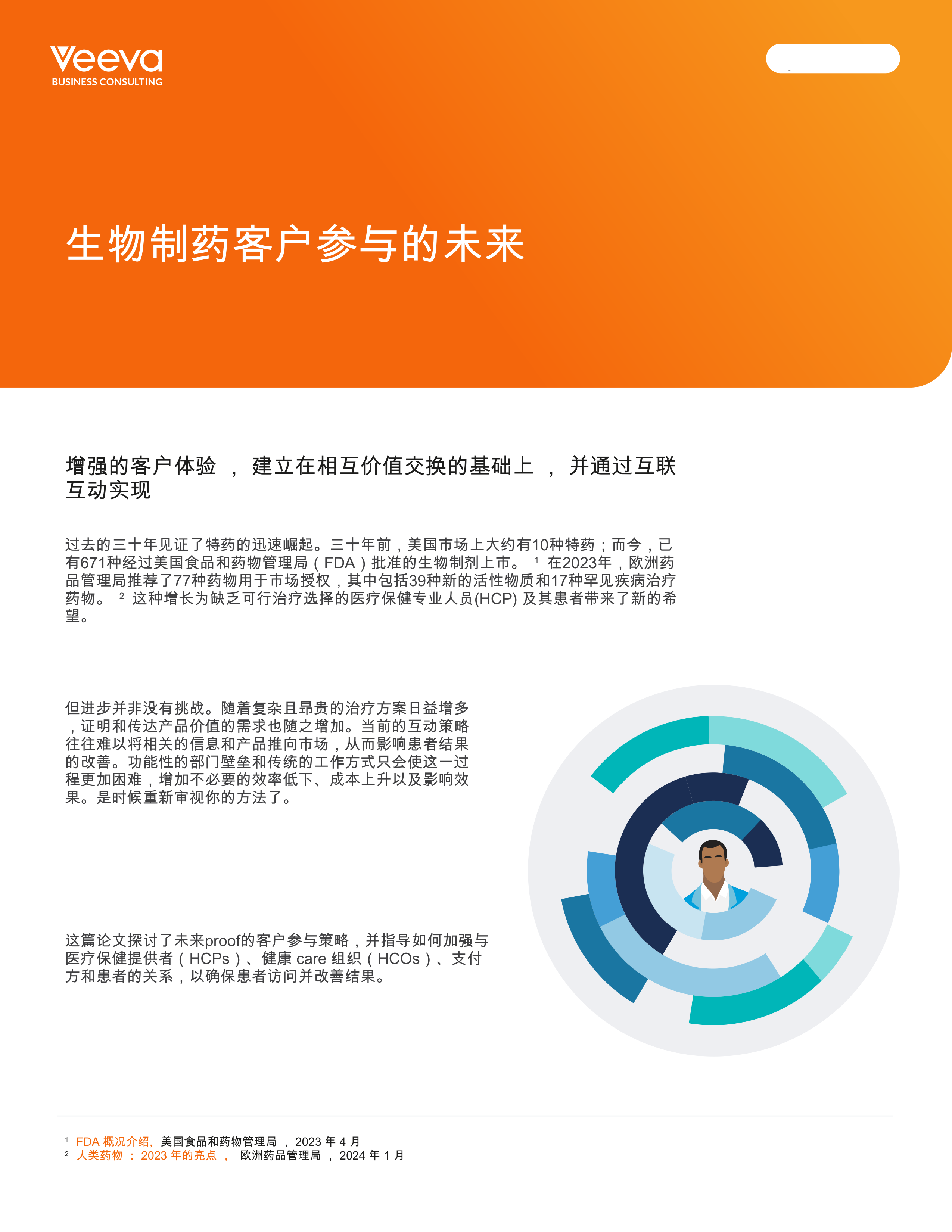 本白皮书深入分析了生物制药行业客户参与模式的转变,并提出了以客户为中心的、互联互动的未来参与战略。 它强调了数据、技术和团队协作的重要性,并提供了具体的策略和工具,以帮助生物制药公司应对日益复杂的市场环境,最终提升患者治疗效果和商业成功。 白皮书最后呼吁生物制药公司进行自我评估,并积极拥抱变革,以在未来的竞争中占据领先地位。 文中多次提及Veeva公司提供的咨询服务,暗示其在帮助生物制药公司实现数字化转型方面的专业能力。