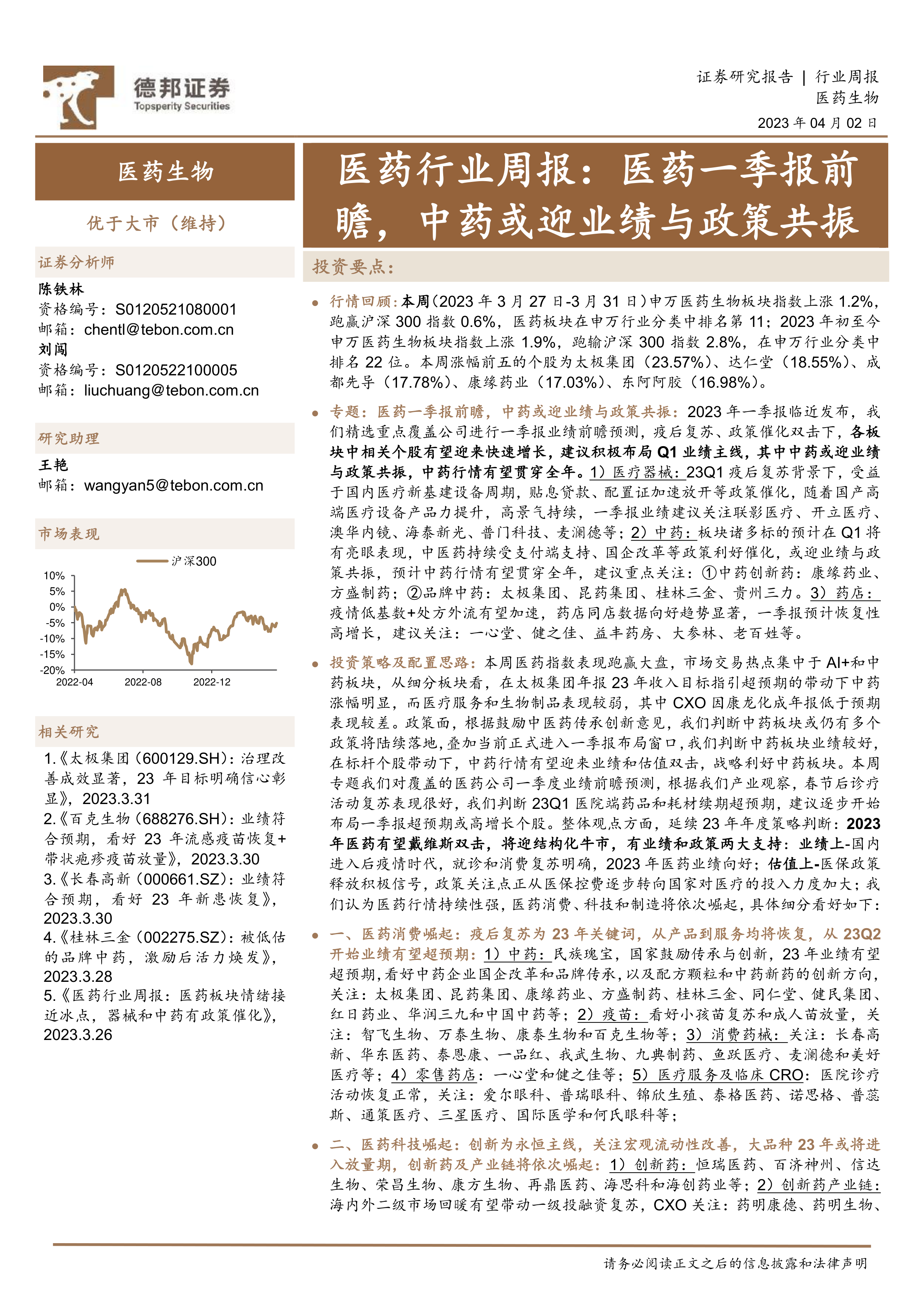 行情回顾:本周(2023年3月27日-3月31日)申万医药生物板块指数上涨1.2%,跑赢沪深300指数0.6%,医药板块在申万行业分类中排名第11;2023年初至今申万医药生物板块指数上涨1.9%,跑输沪深300指数2.8%,在申万行业分类中排名22位。本周涨幅前五的个股为太极集团(23.57%)、达仁堂(18.55%)、成都先导(17.78%)、康缘药业(17.03%)、东阿阿胶(16.98%)。