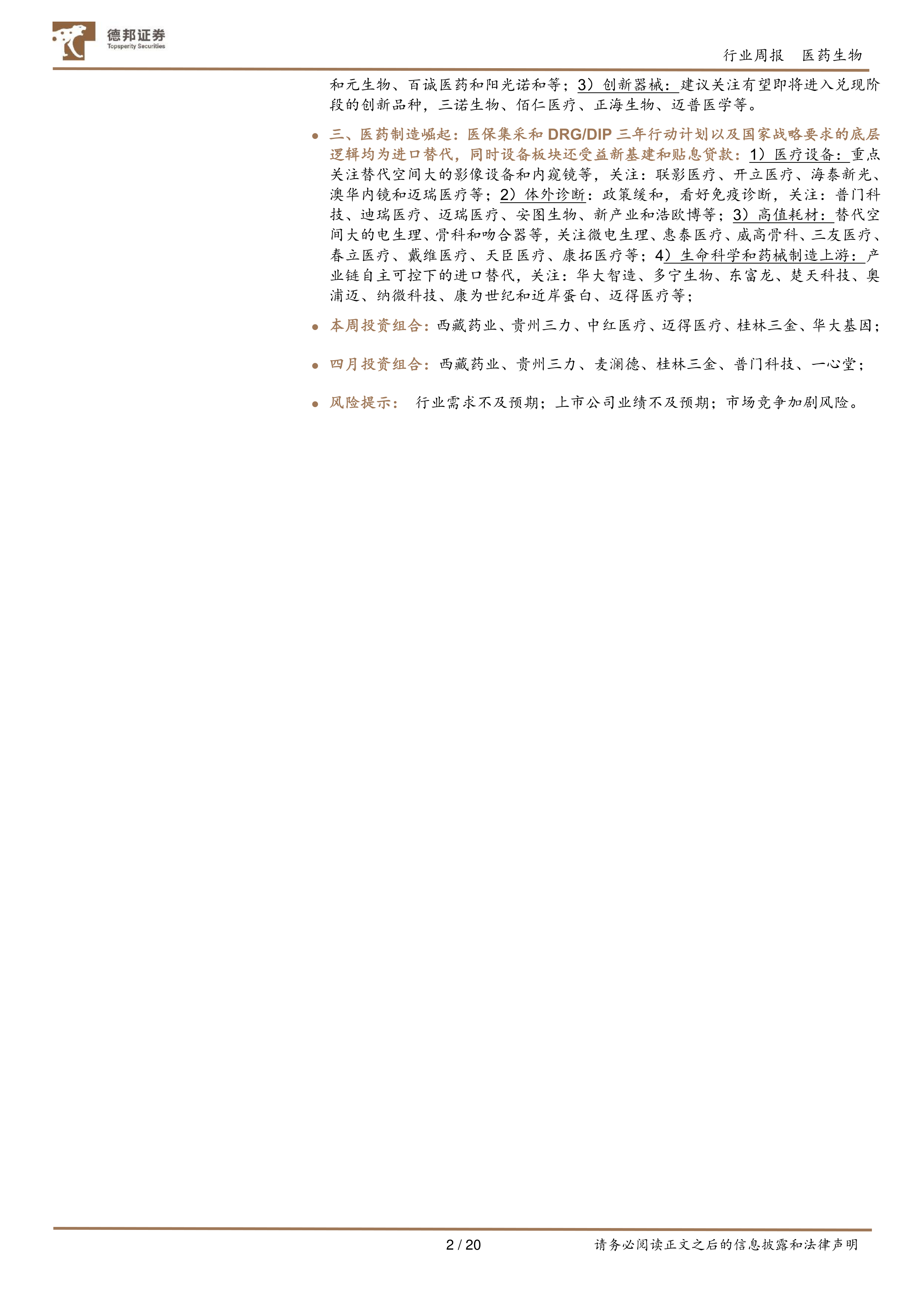 三、医药制造崛起:医保集采和DRG/DIP三年行动计划以及国家战略要求的底层逻辑均为进口替代,同时设备板块还受益新基建和贴息贷款:1)医疗设备:重点关注替代空间大的影像设备和内窥镜等,关注:联影医疗、开立医疗、海泰新光、澳华内镜和迈瑞医疗等;2)体外诊断:政策缓和,看好免疫诊断,关注:普门科技、迪瑞医疗、迈瑞医疗、安图生物、新产业和浩欧博等;3)高值耗材:替代空间大的电生理、骨科和吻合器等,关注微电生理、惠泰医疗、威高骨科、三友医疗、春立医疗、戴维医疗、天臣医疗、康拓医疗等;4)生命科学和药械制造上游:产业链自主可控下的进口替代,关注:华大智造、多宁生物、东富龙、楚天科技、奥浦迈、纳微科技、康为世纪和近岸蛋白、迈得医疗等;