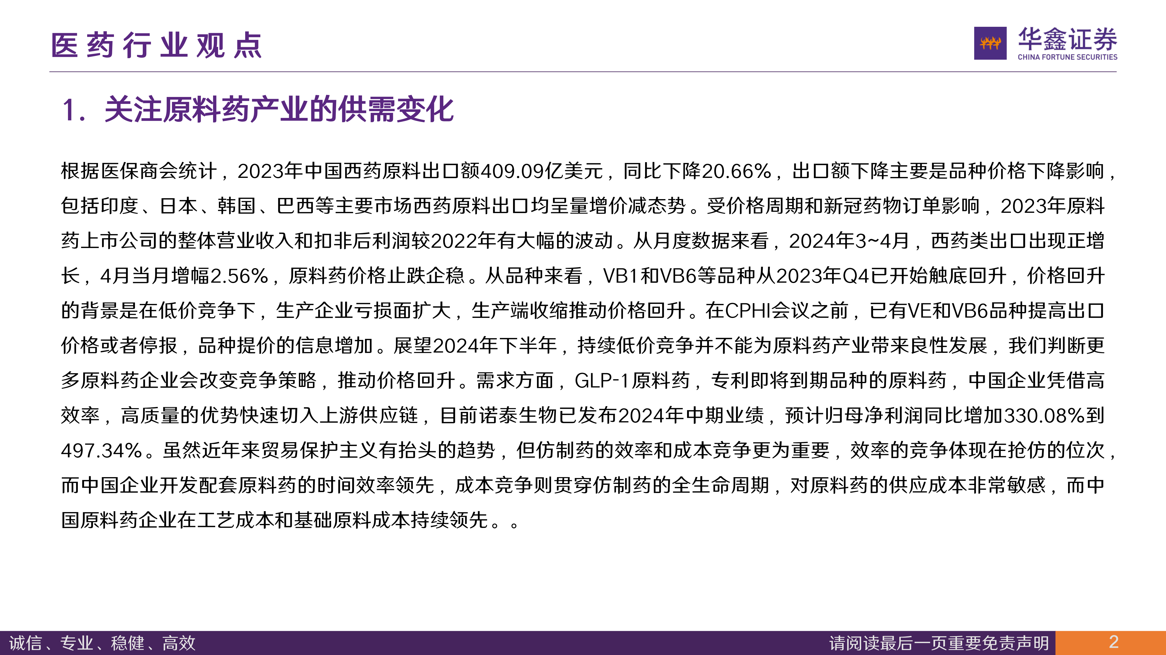 根据医保商会统计, 2023年中国西药原料出口额409.09亿美元, 同比下降20.66%, 出口额下降主要是品种价格下降影响,包括印度、 日本、 韩国、 巴西等主要市场西药原料出口均呈量增价减态势。 受价格周期和新冠药物订单影响, 2023年原料药上市公司的整体营业收入和扣非后利润较2022年有大幅的波动。 从月度数据来看, 2024年3~4月, 西药类出口出现正增长, 4月当月增幅2.56%, 原料药价格止跌企稳。 从品种来看, VB1和VB6等品种从2023年Q4已开始触底回升, 价格回升的背景是在低价竞争下, 生产企业亏损面扩大, 生产端收缩推动价格回升。 在CPHI会议之前, 已有VE和VB6品种提高出口价格或者停报, 品种提价的信息增加。 展望2024年下半年, 持续低价竞争并不能为原料药产业带来良性发展, 我们判断更多原料药企业会改变竞争策略, 推动价格回升。 需求方面, GLP-1原料药, 专利即将到期品种的原料药, 中国企业凭借高效率, 高质量的优势快速切入上游供应链, 目前诺泰生物已发布2024年中期业绩, 预计归母净利润同比增加330.08%到497.34%。 虽然近年来贸易保护主义有抬头的趋势, 但仿制药的效率和成本竞争更为重要, 效率的竞争体现在抢仿的位次,而中国企业开发配套原料药的时间效率领先, 成本竞争则贯穿仿制药的全生命周期, 对原料药的供应成本非常敏感, 而中国原料药企业在工艺成本和基础原料成本持续领先。。