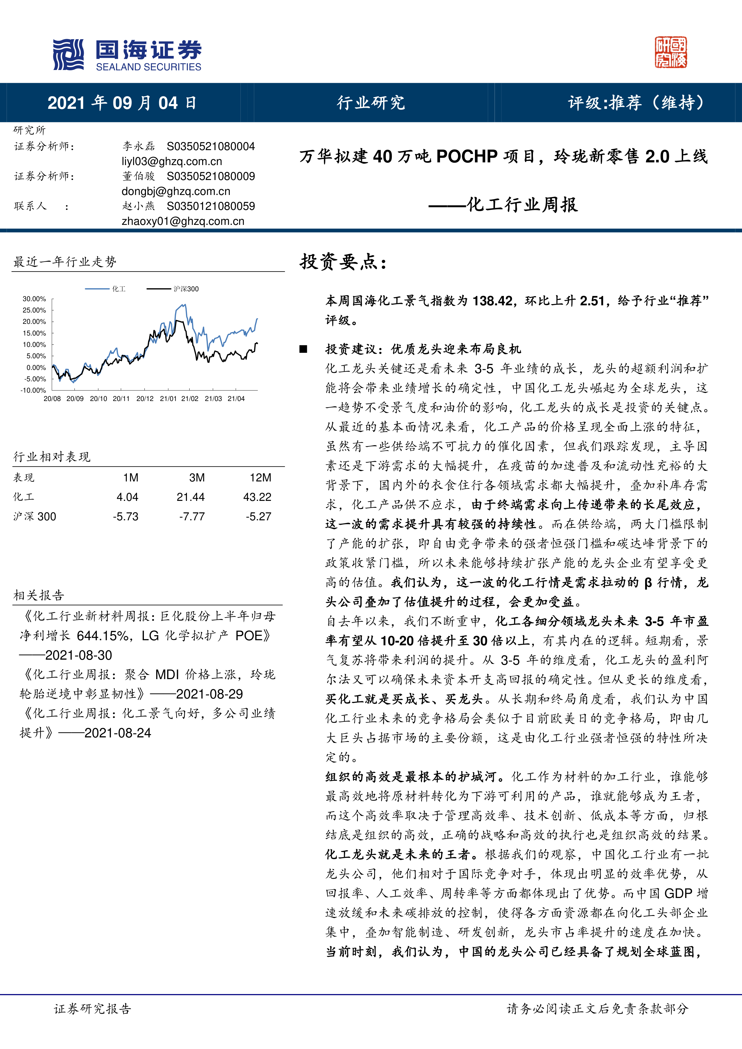 化工龙头关键还是看未来3-5年业绩的成长,龙头的超额利润和扩能将会带来业绩增长的确定性,中国化工龙头崛起为全球龙头,这一趋势不受景气度和油价的影响,化工龙头的成长是投资的关键点。从最近的基本面情况来看,化工产品的价格呈现全面上涨的特征,虽然有一些供给端不可抗力的催化因素,但我们跟踪发现,主导因素还是下游需求的大幅提升,在疫苗的加速普及和流动性充裕的大背景下,国内外的衣食住行各领域需求都大幅提升,叠加补库存需求,化工产品供不应求,由于终端需求向上传递带来的长尾效应,这一波的需求提升具有较强的持续性。而在供给端,两大门槛限制了产能的扩张,即自由竞争带来的强者恒强门槛和碳达峰背景下的政策收紧门槛,所以未来能够持续扩张产能的龙头企业有望享受更高的估值。我们认为,这一波的化工行情是需求拉动的β行情,龙头公司叠加了估值提升的过程,会更加受益。