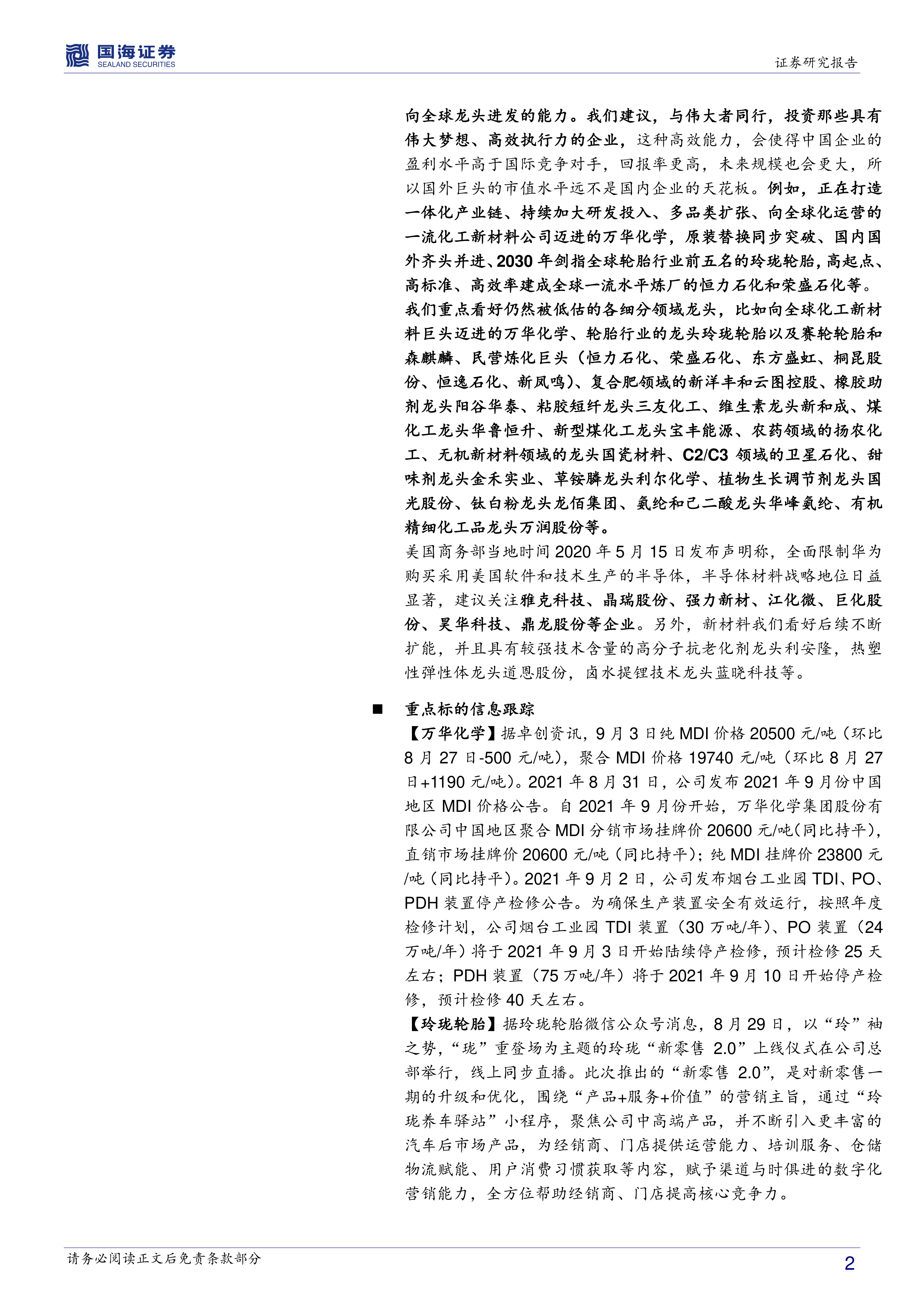报告对万华化学、玲珑轮胎、赛轮轮胎、森麒麟、恒力石化、荣盛石化、东方盛虹、恒逸石化、桐昆股份、新凤鸣、新洋丰、云图控股、龙佰集团、中毅达、阳谷华泰、双箭股份、华峰化学、新和成、三友化工、华鲁恒升、宝丰能源、金禾实业、国瓷材料、扬农化工、利尔化学、国光股份、卫星石化、三棵树、金发科技、道恩股份、万润股份、齐翔腾达、利安隆、雅克科技、江化微、蓝晓科技等多家化工龙头企业进行了详细的跟踪分析,内容涵盖了公司业绩、产能扩张、技术创新、市场份额、价格走势等多个方面。 例如,报告详细分析了万华化学的MDI价格走势、产能扩张计划以及技术创新能力;分析了玲珑轮胎的新零售2.0战略以及在中高端配套领域的突破;分析了赛轮轮胎的全球化布局和橡胶工业互联网平台建设等。 报告还提供了大量图表数据,直观地展现了各公司及相关产品的价格走势、库存情况等关键信息。