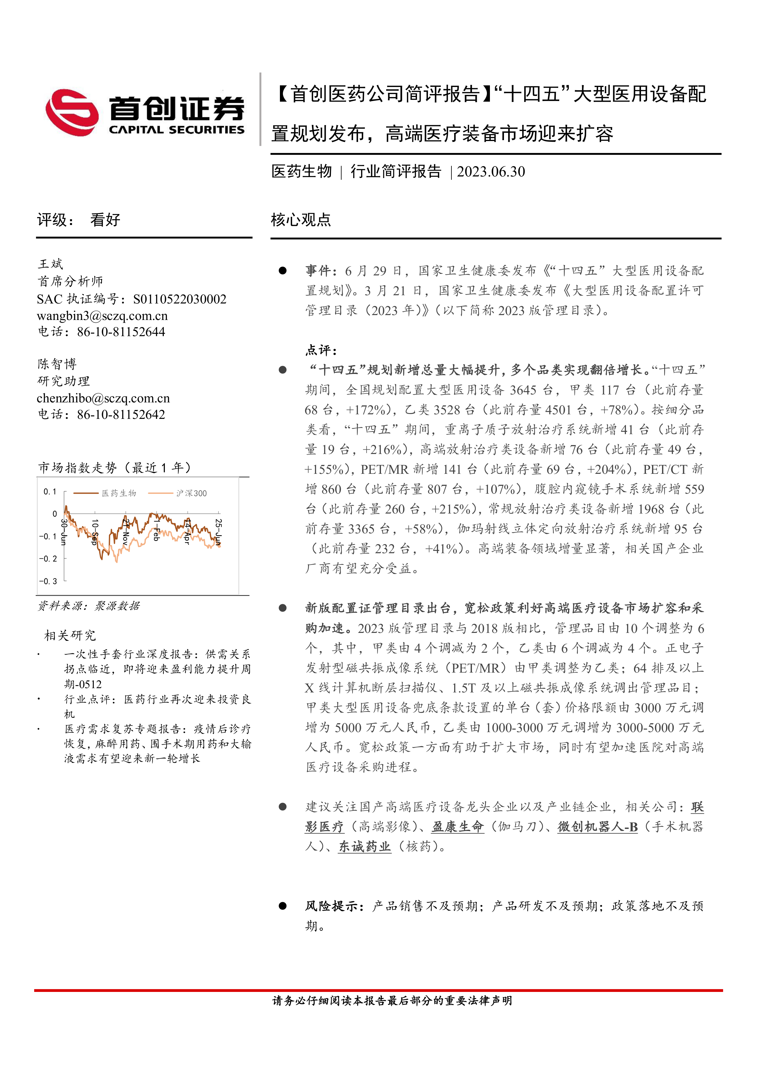 事件:6月29日,国家卫生健康委发布《“十四五”大型医用设备配置规划》。3月21日,国家卫生健康委发布《大型医用设备配置许可管理目录(2023年)》(以下简称2023版管理目录)。