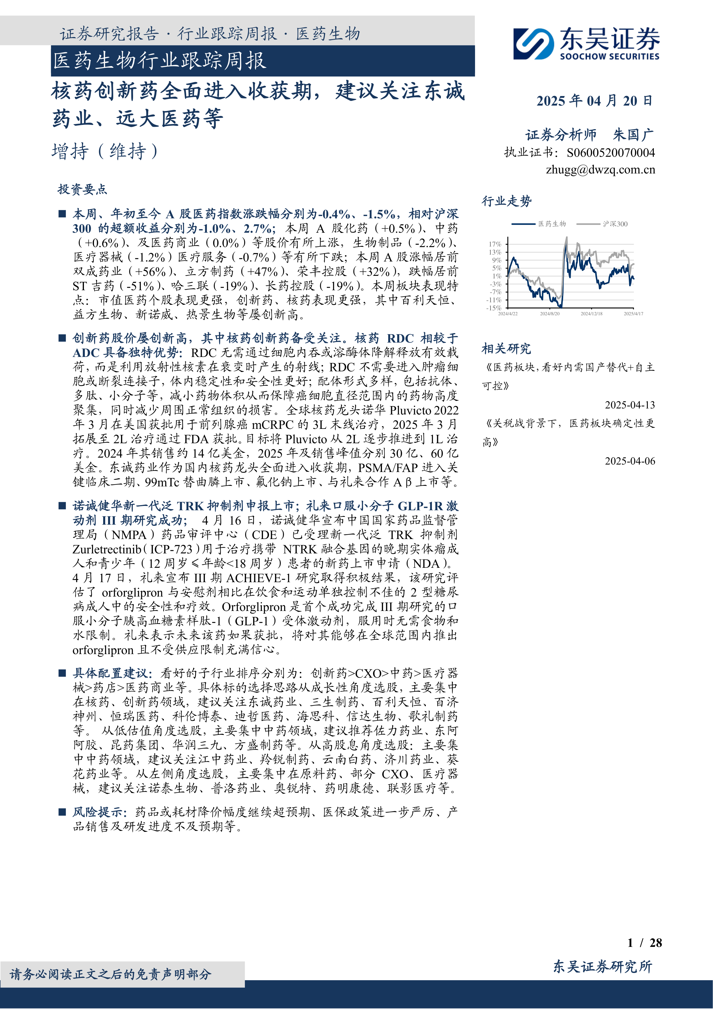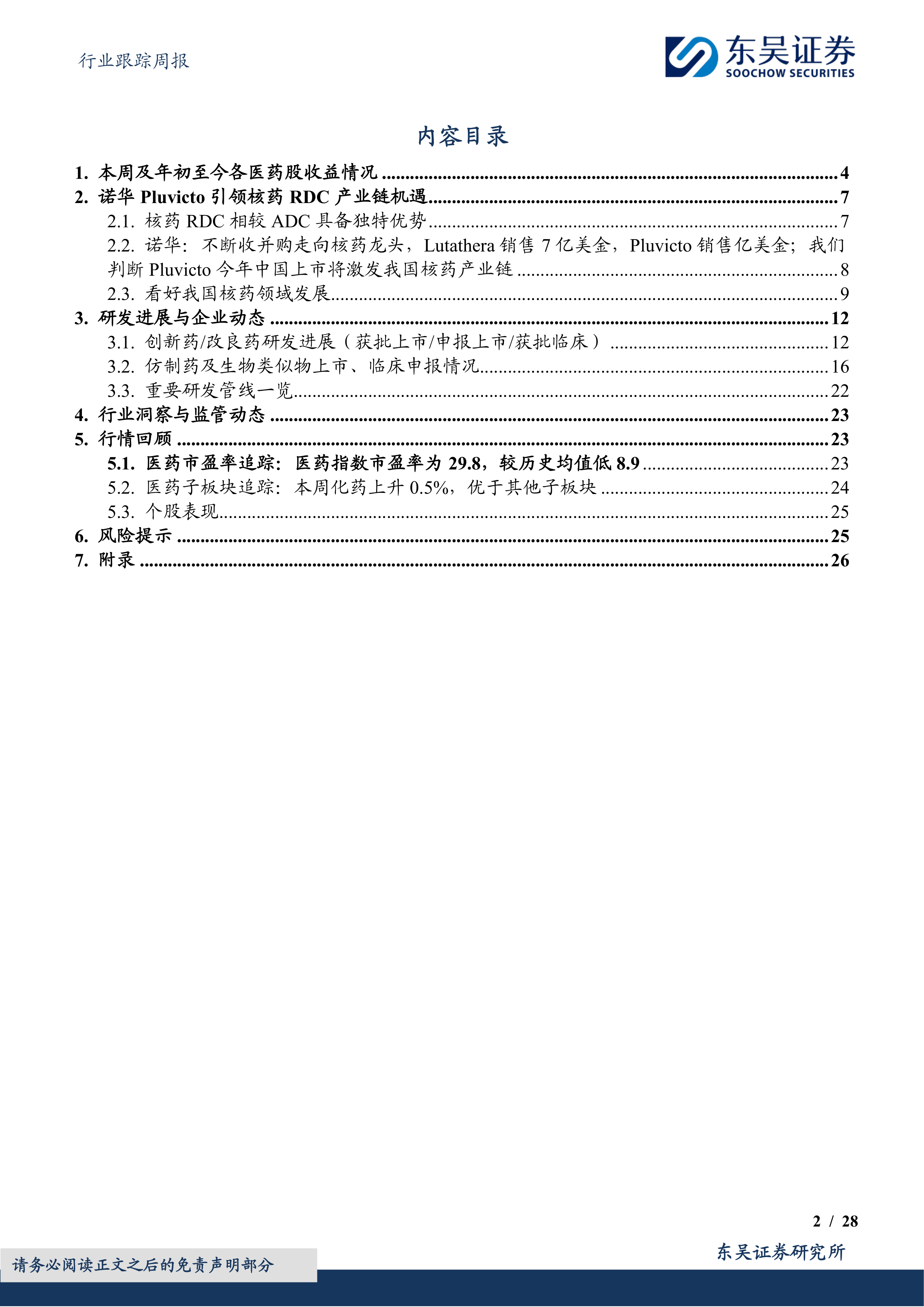 本报告通过对医药生物行业市场走势、核药RDC技术、研发进展以及行业监管等方面的分析,指出核药创新药正全面进入收获期,并建议投资者关注东诚药业、远大医药等具有核心竞争力的企业。报告同时提示了潜在的投资风险,提醒投资者谨慎决策。 报告数据主要来源于Wind数据库以及公司公告,力求客观准确,但投资者仍需独立判断并承担投资风险。