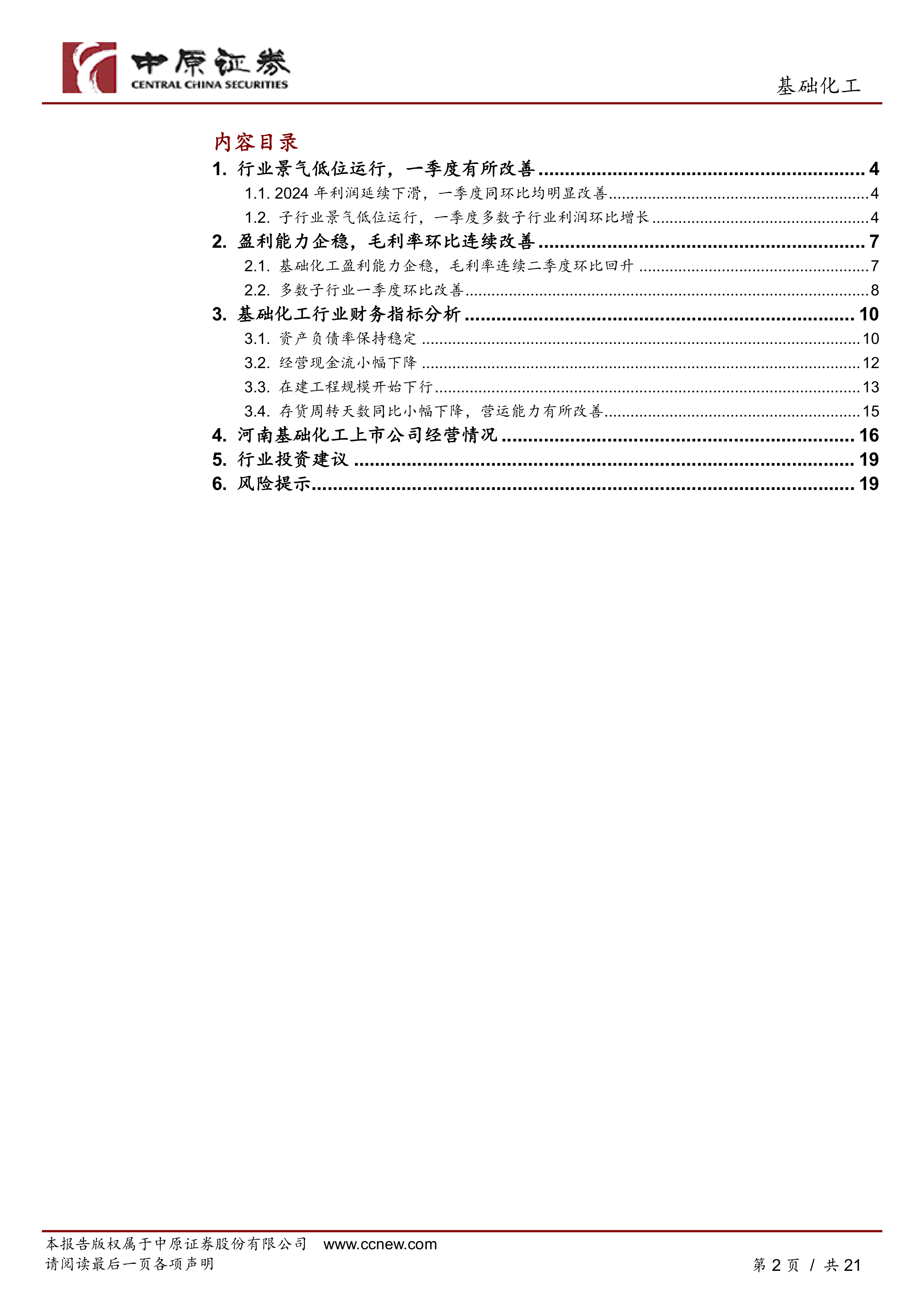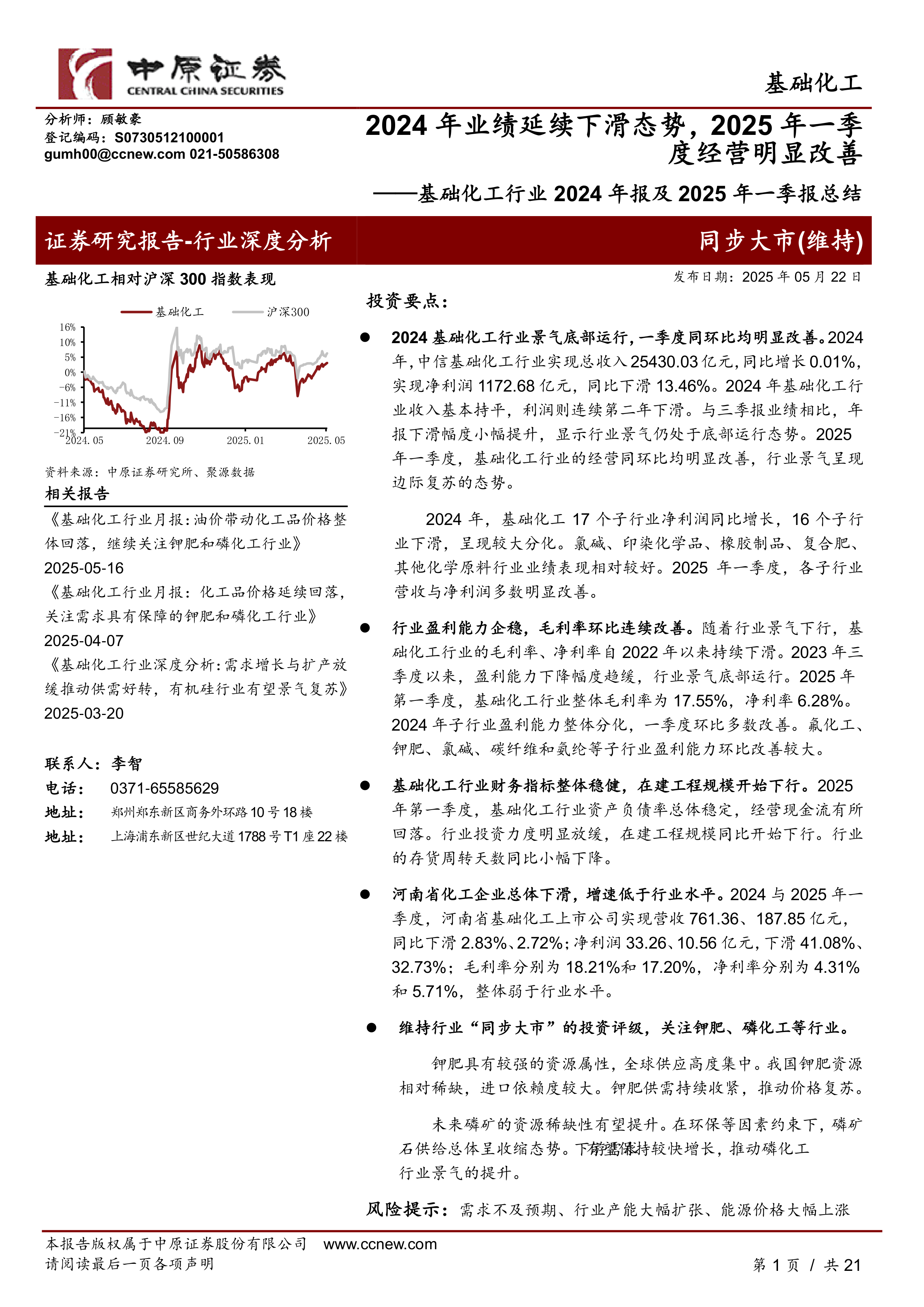 本报告的核心观点是:2024年中国基础化工行业景气度处于底部运行,利润连续第二年下滑;但2025年一季度行业经营状况明显改善,呈现边际复苏态势。行业盈利能力企稳,毛利率环比连续改善,财务指标整体稳健,在建工程规模开始下行。河南省基础化工企业表现弱于行业平均水平。报告建议关注钾肥和磷化工行业,并提示需求不及预期、行业产能大幅扩张、能源价格大幅上涨等风险。