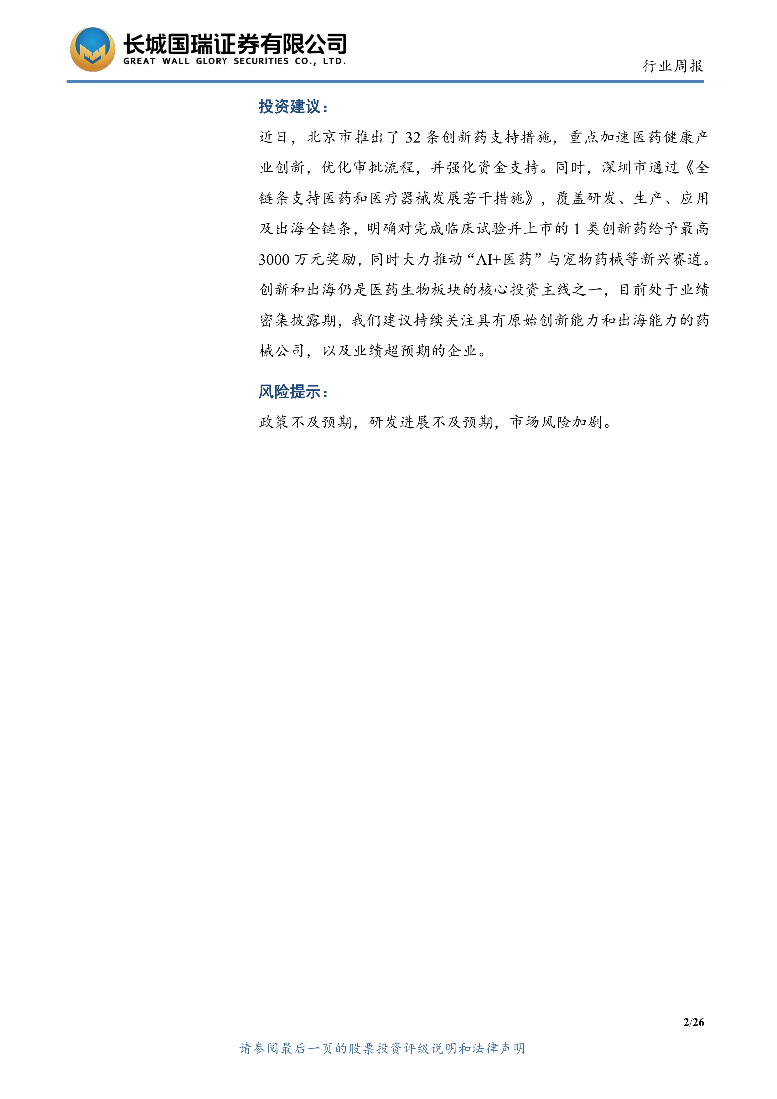 近日,北京市推出了32条创新药支持措施,重点加速医药健康产业创新,优化审批流程,并强化资金支持。同时,深圳市通过《全链条支持医药和医疗器械发展若干措施》,覆盖研发、生产、应用及出海全链条,明确对完成临床试验并上市的1类创新药给予最高3000万元奖励,同时大力推动“AI+医药”与宠物药械等新兴赛道。创新和出海仍是医药生物板块的核心投资主线之一,目前处于业绩密集披露期,我们建议持续关注具有原始创新能力和出海能力的药械公司,以及业绩超预期的企业。