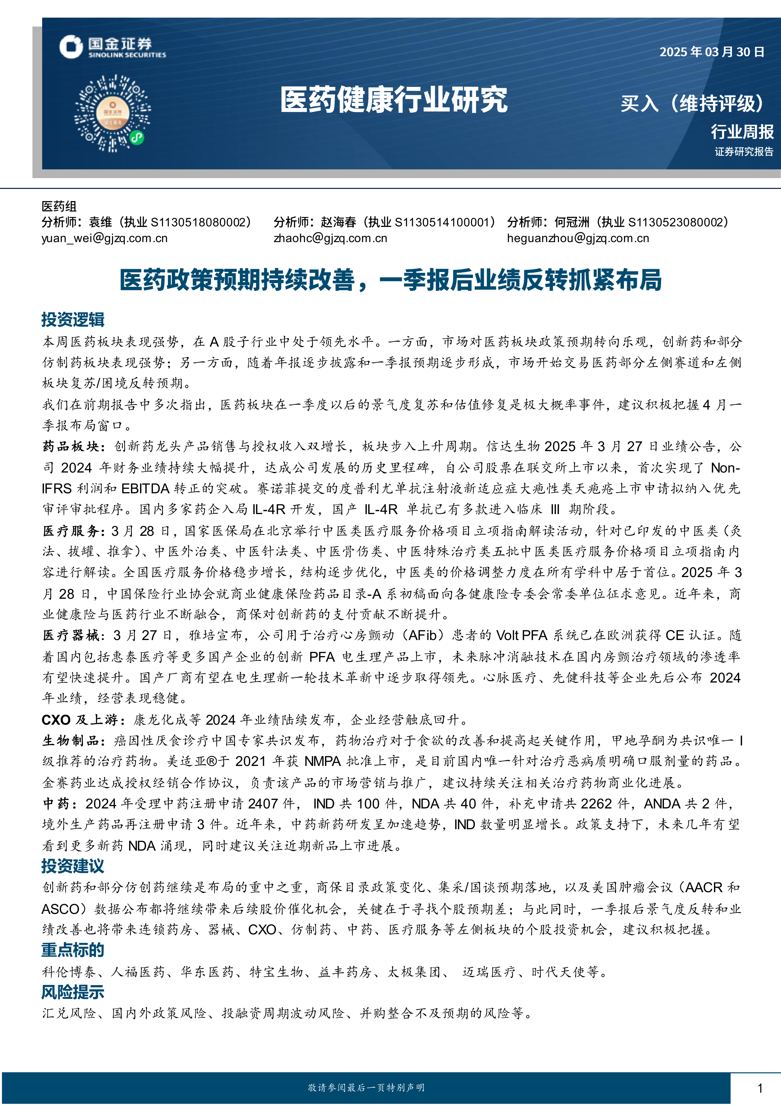 医药健康行业研究:医药政策预期持续改善,一季报后业绩反转抓紧布局