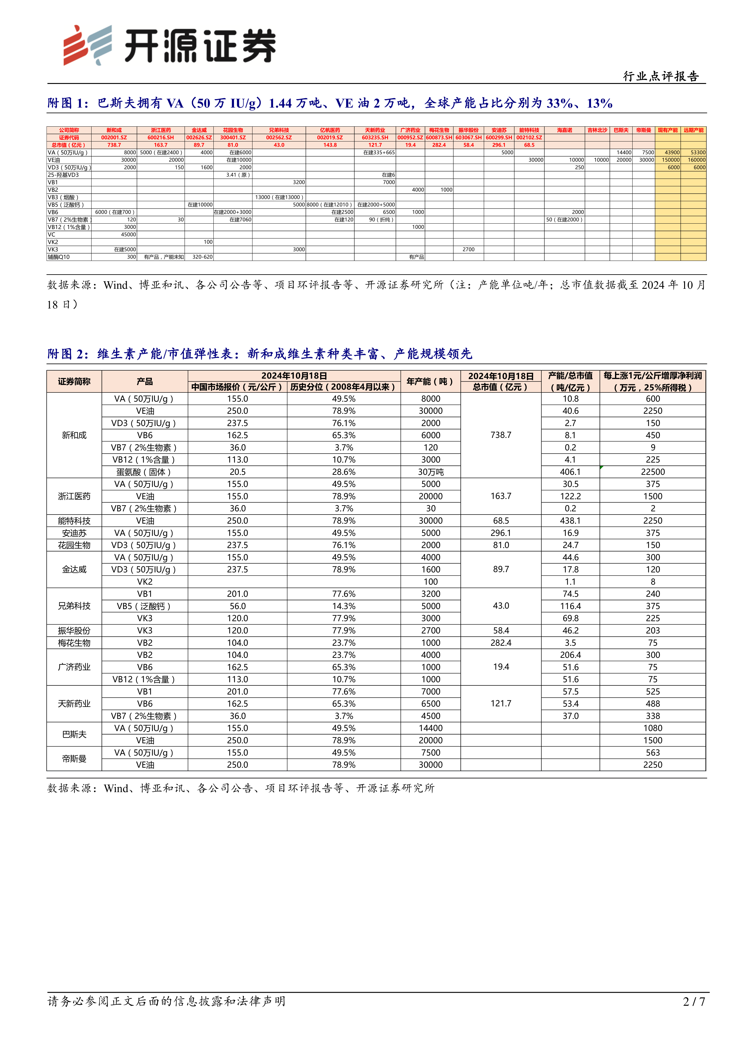 维生素供给集中,2024年出口高增+养殖改善,供给扰动或支撑VE继续上行(1)VA供给端:全球VA(50万IU/g)产能4.39万吨,包括:巴斯夫1.44万吨、新和成0.8万吨、帝斯曼0.75万吨、浙江医药0.5万吨、安迪苏0.5万吨、金达威0.4万吨,产能占比分别为33%、18%、17%、11%、11%、9%,规划新增产能包括浙江医药0.24万吨、天新药业0.1万吨,此外,万华化学规划4.8万吨柠檬醛及其衍生物一体化项目,而柠檬醛是生产VA及紫罗兰酮、甲基紫罗兰酮、香茅醇、香叶醇等的重要中间体。(2)VE供给端:全球VE油产能15万吨,包括:新和成3万吨、帝斯曼3万吨、能特科技3万吨、巴斯夫2万吨、浙江医药2万吨、海嘉诺1万吨、吉林北沙1万吨,产能占比分别为20%、20%、20%、13%、13%、7%、7%,规划新增产能包括花园生物1万吨。(3)进出口:据Wind数据,2024年1-8月,VA出口量4112吨、同比+28%;VE出口量7.2万吨、同比+31%,此外VE在1-8月各月出口量均高于2019-2023年各月出口量均值。(4)2024Q3维生素E价格大幅上涨后回落,10月18日市场开始止跌。据博亚和讯及饲料巴巴公众号等,复盘VA、VE价格,需求端主要用于饲料添加剂,供给端扰动对产品价格影响较大,其中2017-2018年期间因巴斯夫路德维西港柠檬醛装置事故叠加帝斯曼瑞士工厂事故,VA(50万IU/g)、VE(50%)价格最高分别达到1,425、125元/公斤。2024年以来,维生素供给端扰动不断带动产品价格底部上行,据Wind数据,7月29日巴斯夫火灾事故后VA、VE价格大幅上行,8月25日最高分别达到330、162.5元/公斤,此后由于市场需求不佳,巴斯夫9月5日更新关于相关产品进行第二波库存数量分配,加上贸易商降价出货、海外市场价格下跌等因素影响,截至10月18日VA、VE报价震荡回落至155、125元/公斤,分别处于2008年4月以来的49.5%、78.9%历史分位,较2023年均价分别上涨85%、78%。据百川盈孚数据,10月18日VE开始止跌,市场多数开始停报观望,部分参考成交价上涨至120-125元/公斤左右,且观望惜售情绪浓厚,部分报价上涨至130元/公斤及以上。我们认为,随着下游养殖业盈利改善叠加海外巴斯夫的维生素产能供给不确定性,行业供需改善或带动维生素E景气继续上行、企业盈利修复。推荐标的:新和成。受益标的:浙江医药等。