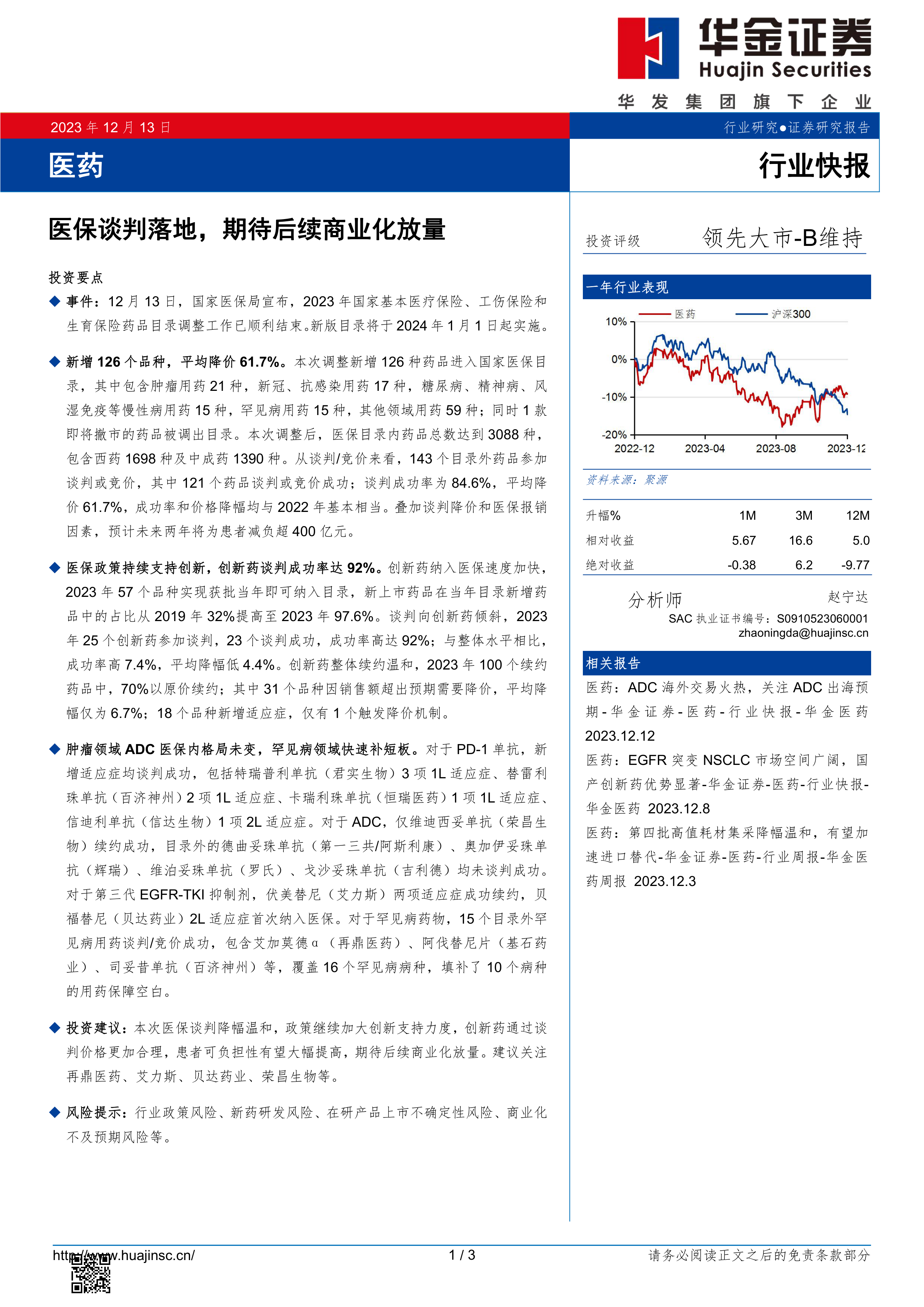 新增 126 个品种, 平均降价 61.7%。 本次调整新增 126 种药品进入国家医保目录, 其中包含肿瘤用药 21 种, 新冠、 抗感染用药 17 种, 糖尿病、 精神病、 风湿免疫等慢性病用药 15 种, 罕见病用药 15 种, 其他领域用药 59 种; 同时 1 款即将撤市的药品被调出目录。 本次调整后, 医保目录内药品总数达到 3088 种,包含西药 1698 种及中成药 1390 种。 从谈判/竞价来看, 143 个目录外药品参加谈判或竞价, 其中 121 个药品谈判或竞价成功; 谈判成功率为 84.6%, 平均降价 61.7%, 成功率和价格降幅均与 2022 年基本相当。 叠加谈判降价和医保报销因素, 预计未来两年将为患者减负超 400 亿元。