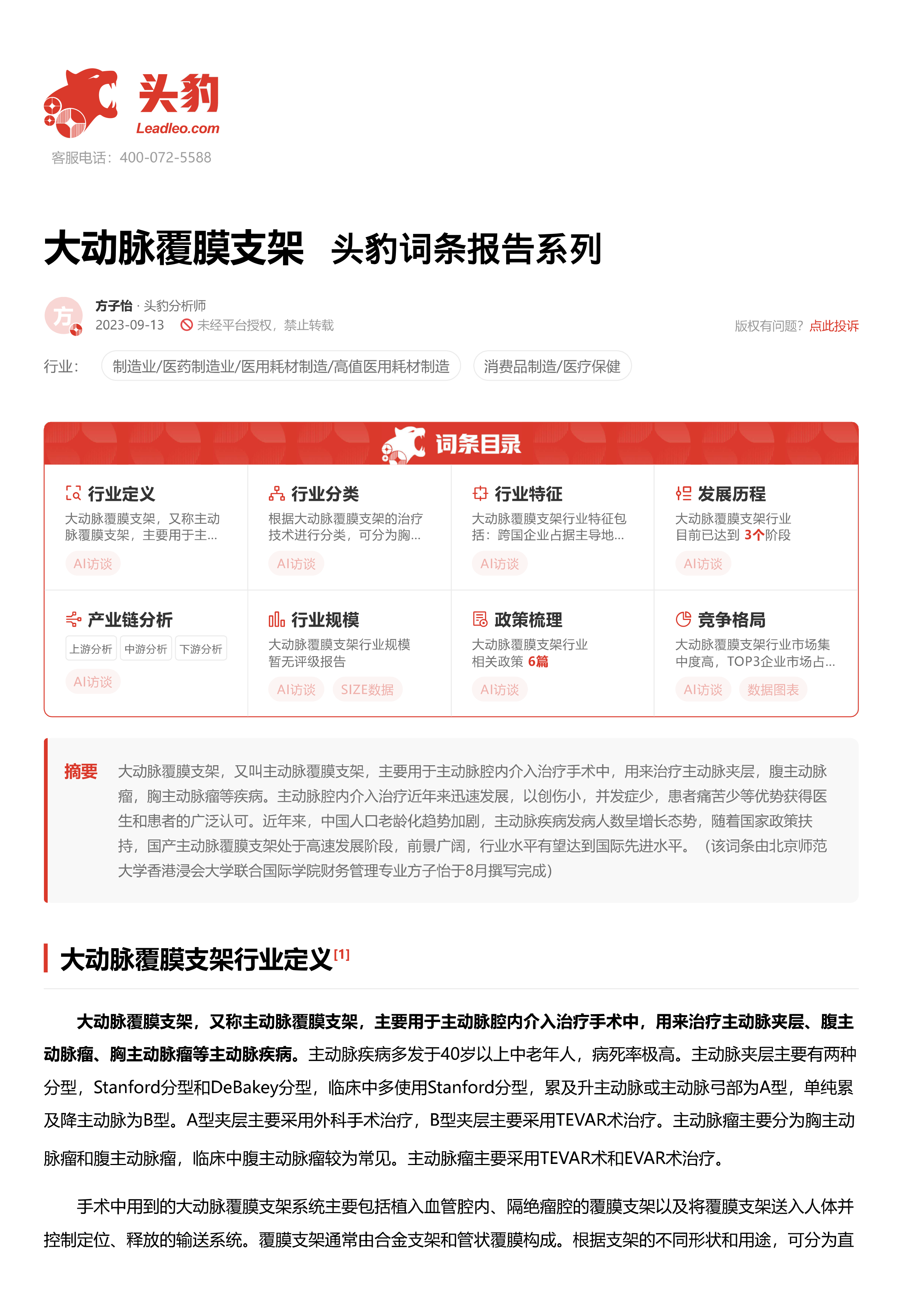 大动脉覆膜支架 头豹词条报告系列