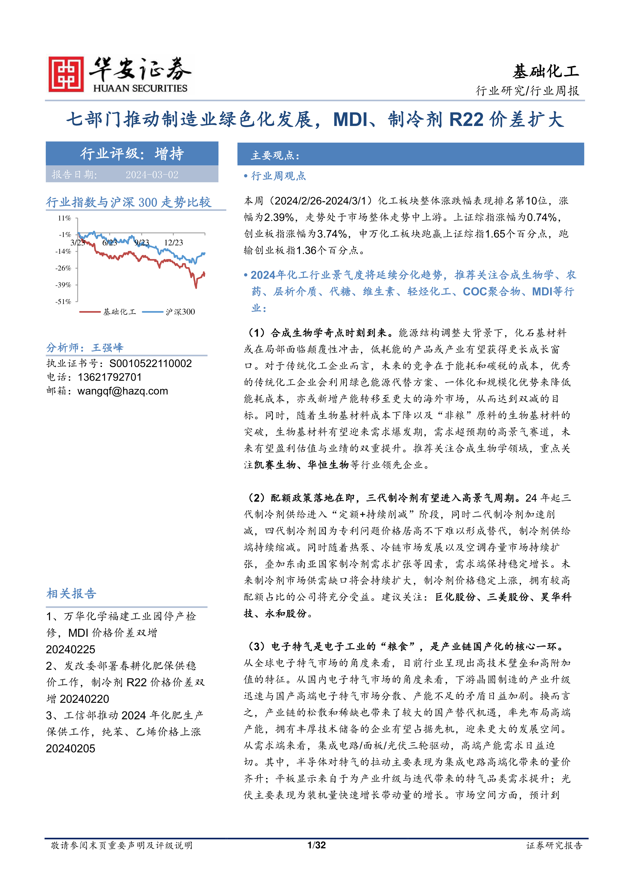 本报告以2024年3月2日为报告日期,对化工行业进行了周度回顾和重点行业跟踪分析。