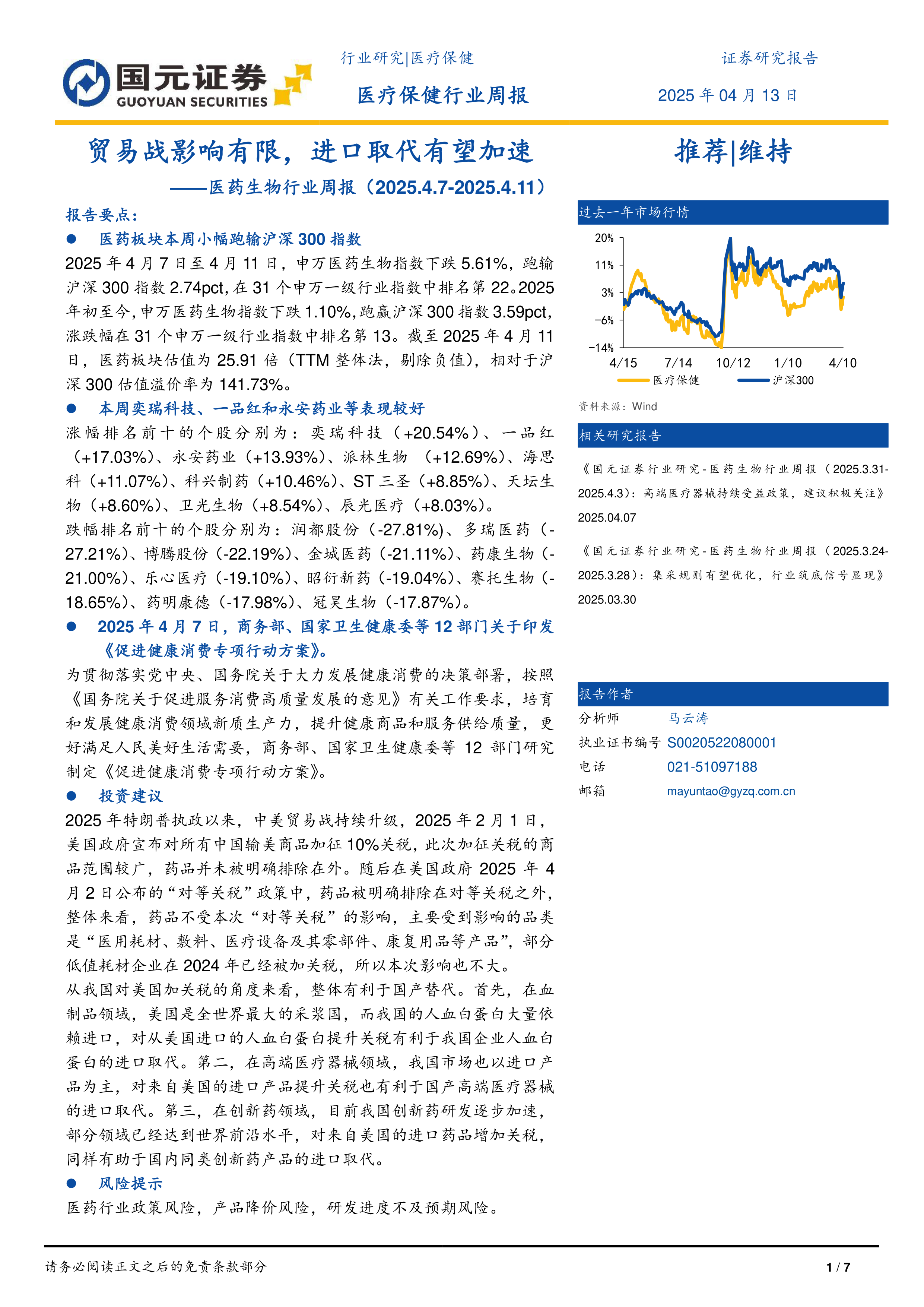 本报告对2025年4月7日至11日医药行业市场表现进行了回顾,分析了中美贸易战对医药行业的影响,并指出了国产替代的机遇。报告数据显示,虽然本周医药板块表现略逊于大盘,但年初至今跑赢大盘。 同时,报告也强调了医药行业面临的政策、价格和研发风险,为投资者提供了较为全面的市场分析和风险提示。 中美贸易战对医药行业的影响相对有限,但关税政策将加速国产替代进程,这将是未来医药行业发展的重要趋势。 投资者需密切关注相关政策变化和市场风险,谨慎投资。