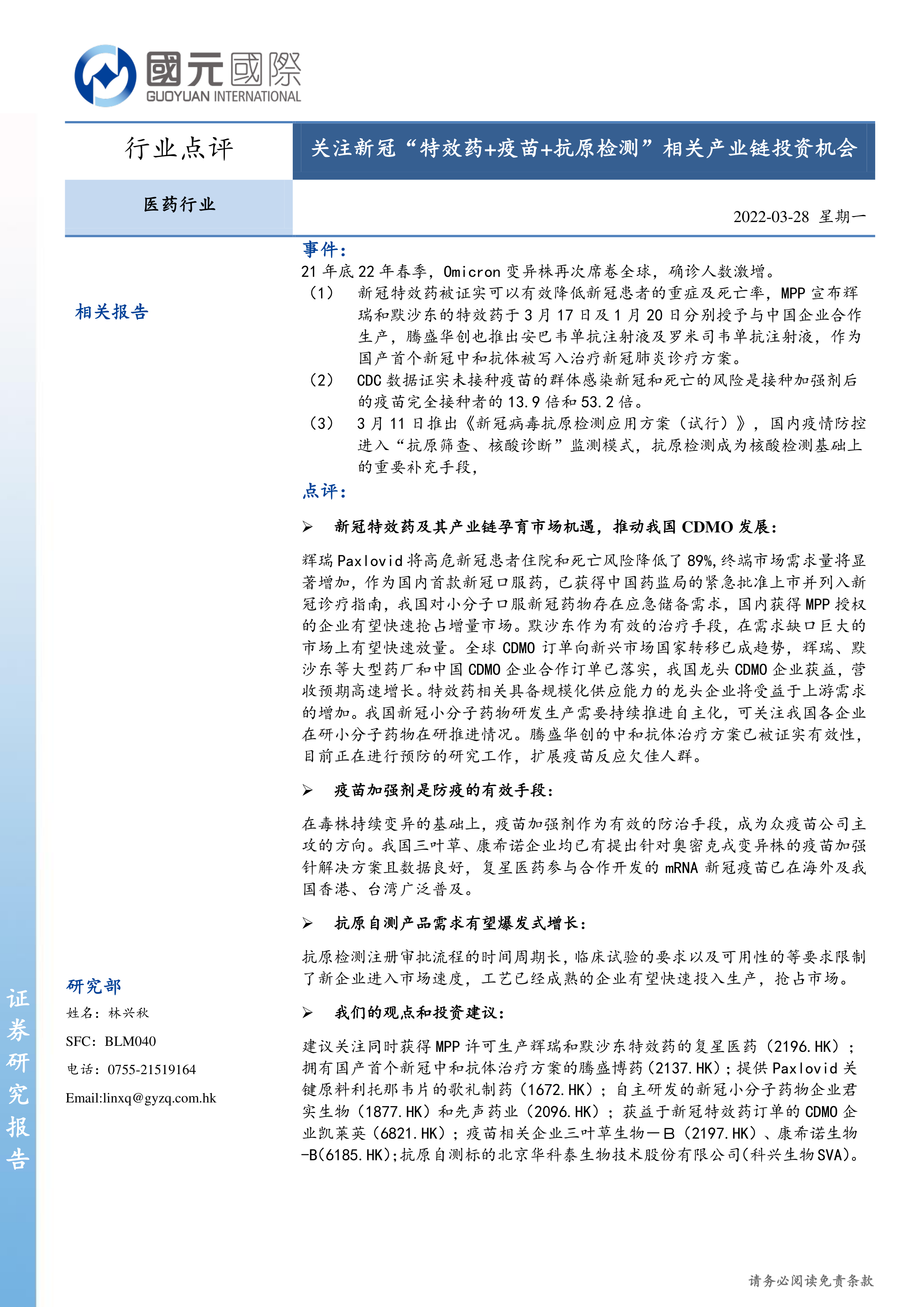 医药行业:关注新冠“特效药+疫苗+抗原检测”相关产业链投资机会