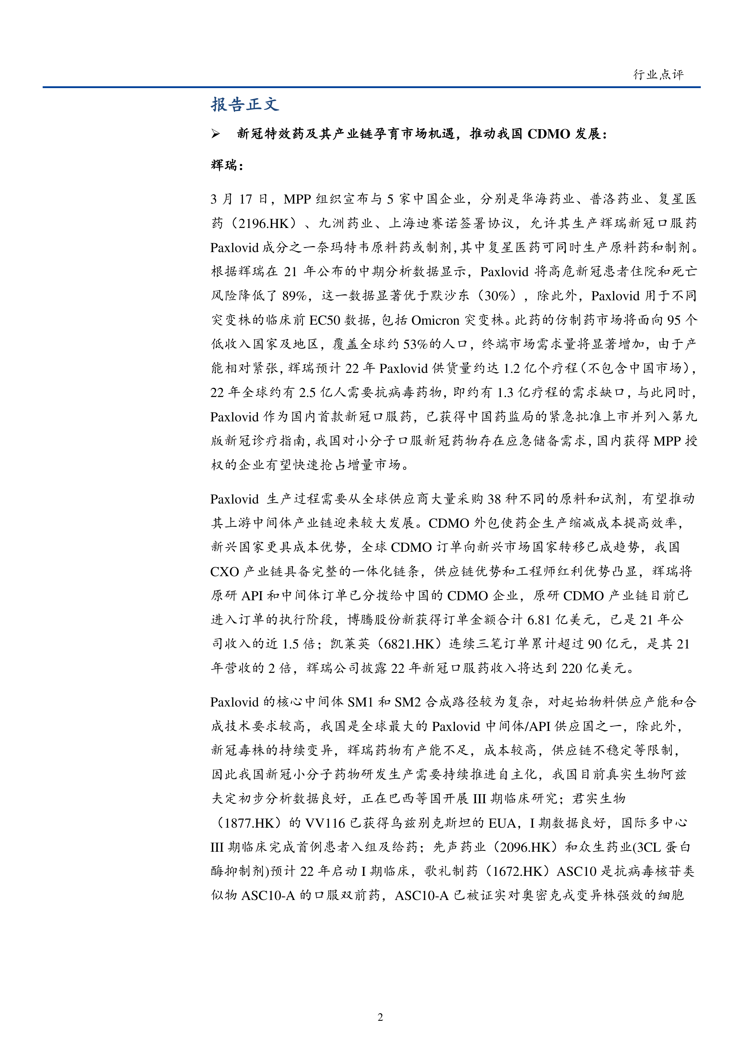 新冠特效药及其产业链孕育市场机遇,推动我国CDMO发展: