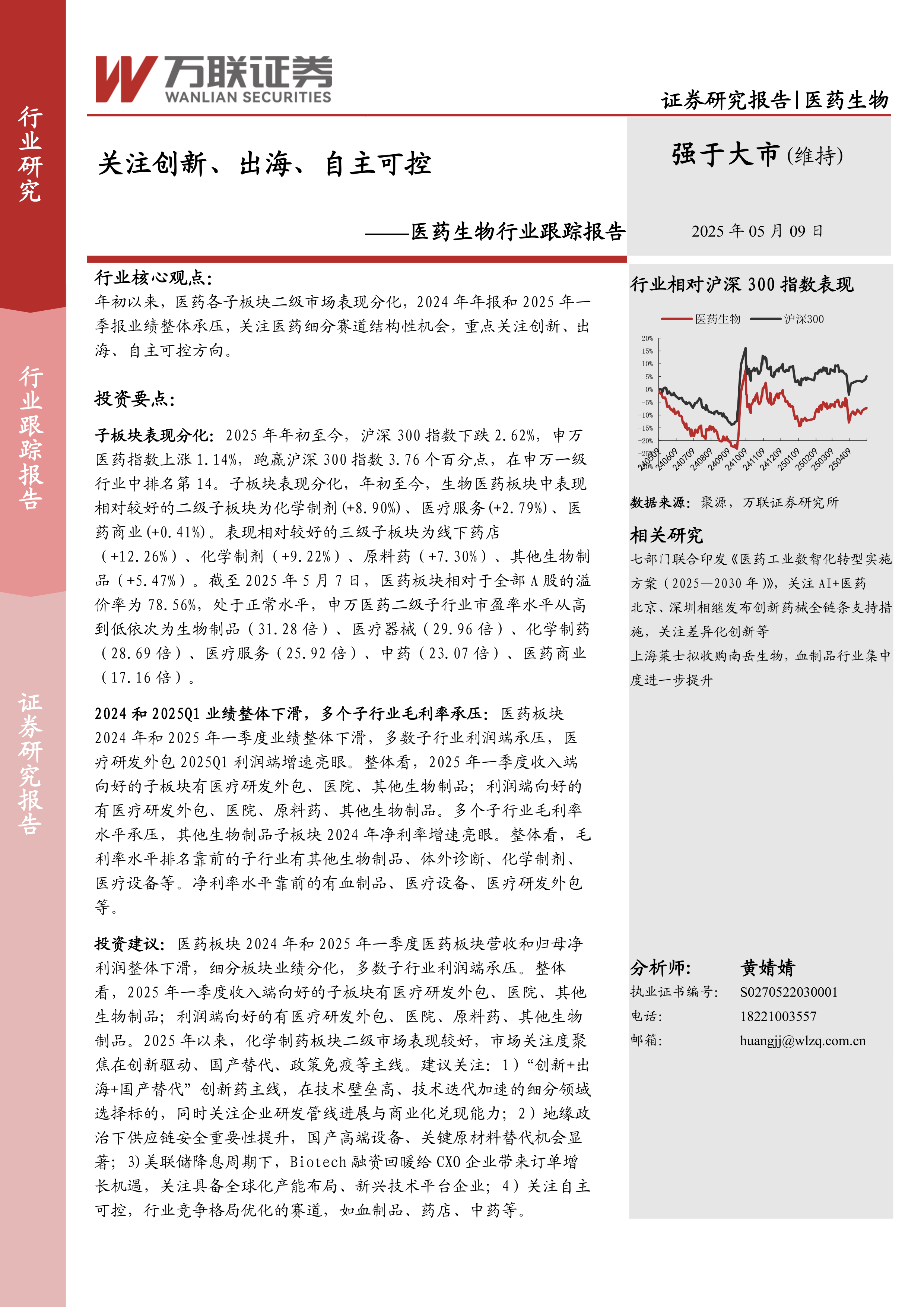 本报告对2025年年初至今医药板块的二级市场表现、2024年和2025年一季度的业绩情况进行了深入分析,并在此基础上提出了相应的投资建议。报告指出,医药板块整体表现强于大盘,但子板块间分化明显,2024-2025Q1业绩整体承压。未来投资应重点关注创新、出海和自主可控等方向,选择具备技术壁垒、研发实力强劲、商业化能力突出的企业,同时需关注潜在的风险因素。 报告数据主要来源于Wind和万联证券研究所,并对数据进行了详细的解读和分析,为投资者提供了有价值的参考信息。