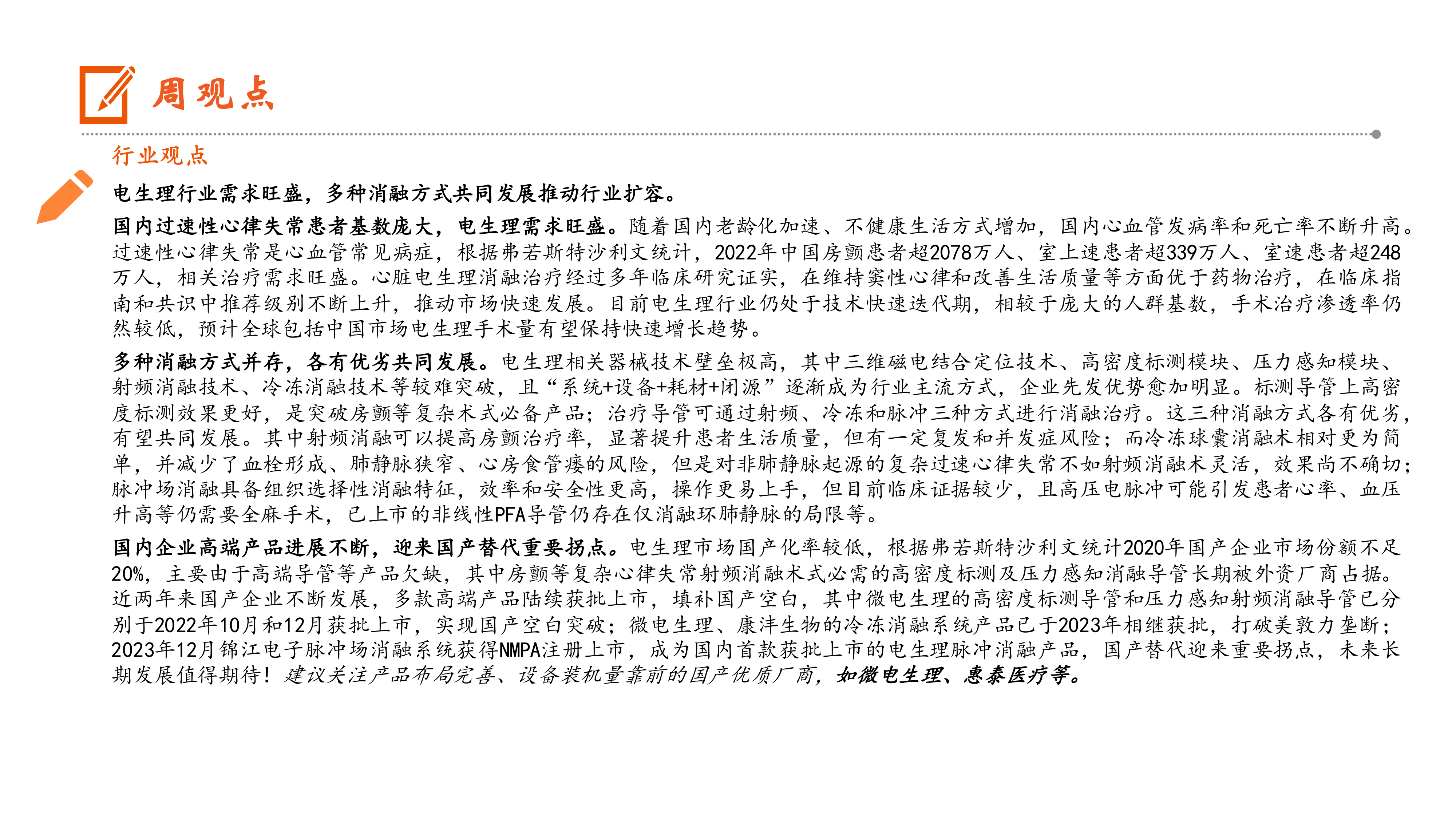 本报告的核心观点是:中国电生理行业需求旺盛,多种消融方式共同发展推动行业扩容,国产替代迎来重要拐点。