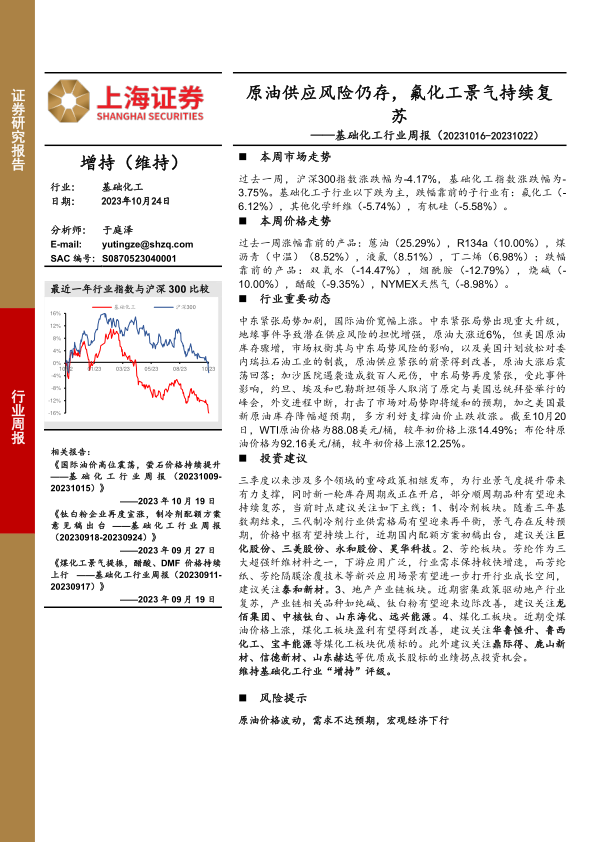 基础化工行业周报:原油供应风险仍存,氟化工景气持续复苏