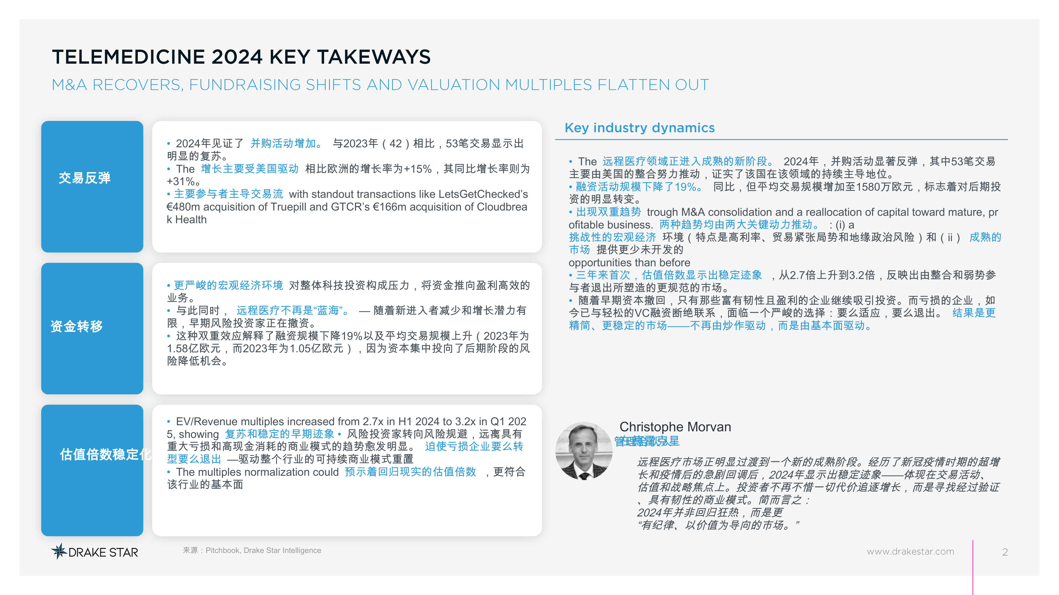 The远程医疗领域正进入成熟的新阶段。2024年,并购活动显著反弹,其中53笔交易主要由美国的整合努力推动,证实了该国在该领域的持续主导地位。